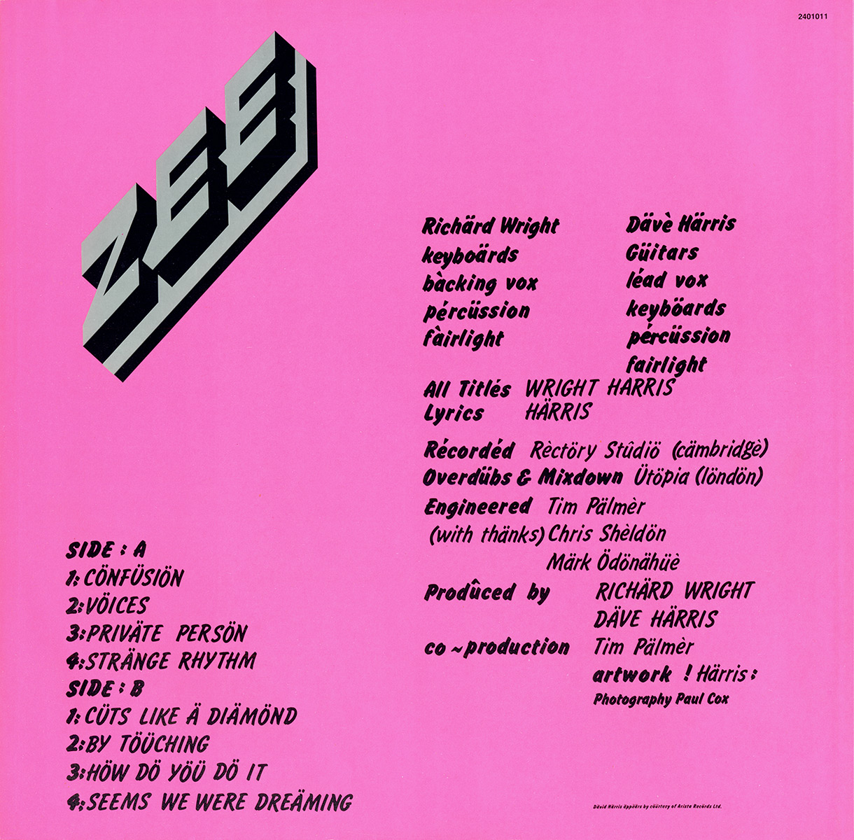 Back Cover: Silver. In the upper right half is the tracklisting. In the upper right corner is the catalog number 1A 064 2401011 and the MC number 1A 264 2401018. In the lower left corner are photos of Richard Wright and Dave Harris. At the bottom, it says "Marketed, manufactured and distributed by EMI. Printed in Holland by EMI Services Benelux, B.V.,Uden."