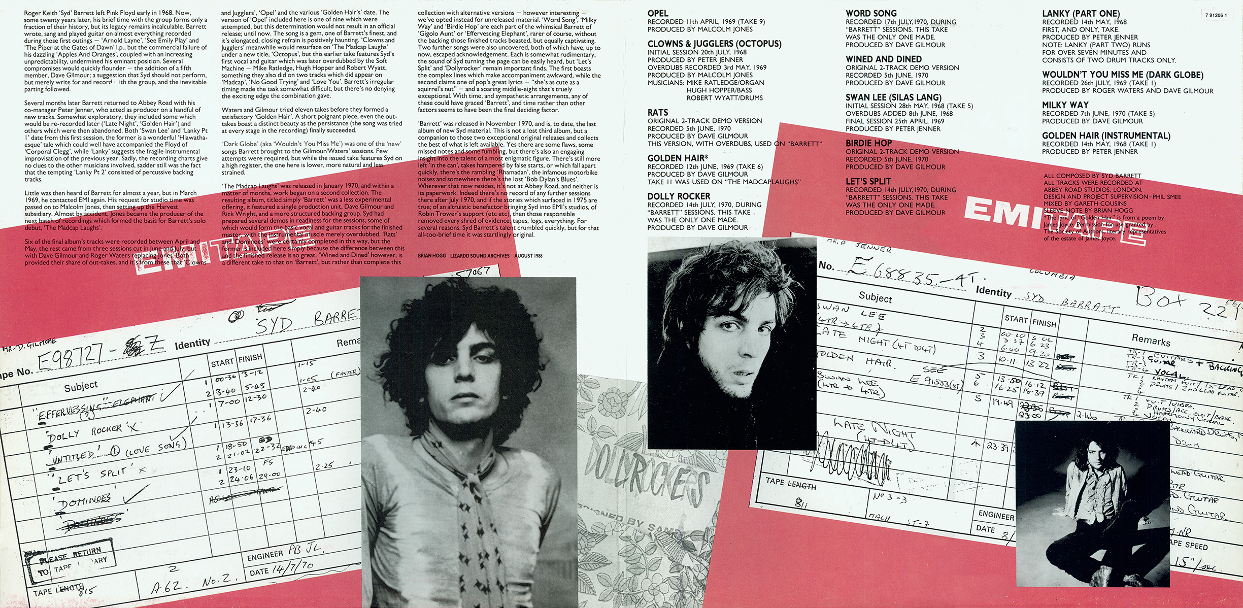 Inside Cover: On the left is the story of Syd Barrett. On the right is the tracklisting and credits. On both sides are three Syd Barrett photos and comments about the EMI tapes. On the right side it says: SYD BARRATT.