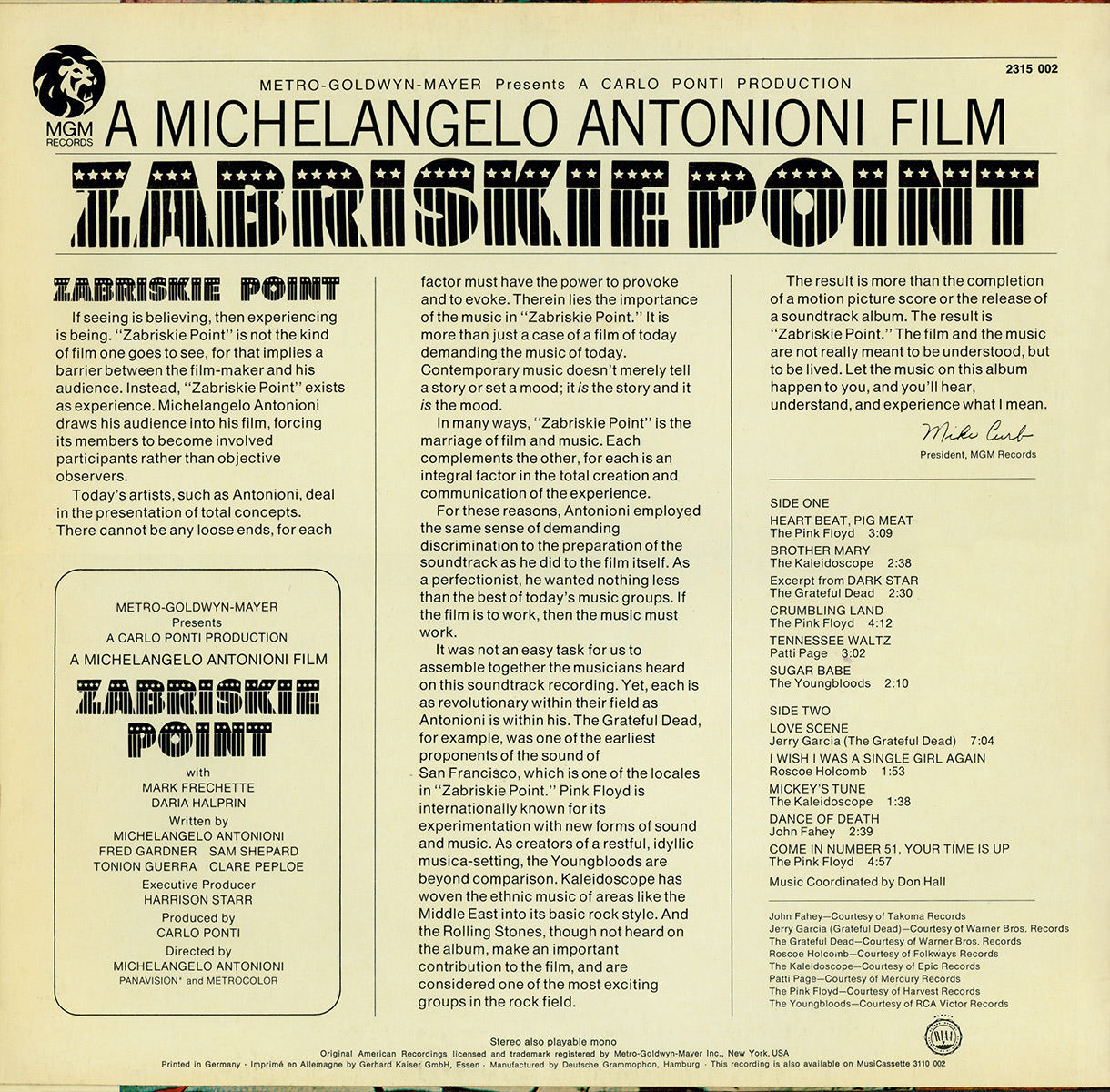 Test Pressing: A Unverkaeufliche Musterplatte test pressing was made. Catalog number: 2315 002. White MGM label. Matrix: I (P) 1970 C70 <> Z < I 00 2315 002 / I (P) 1970 C70 C 00 2315 002 S2.
