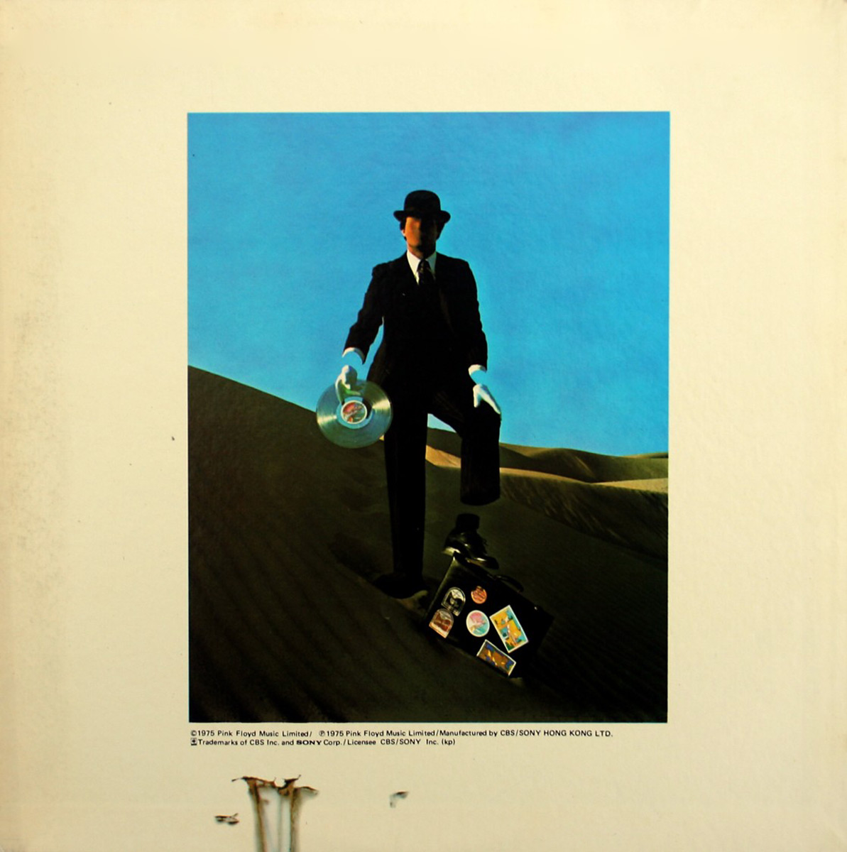 Back Cover: Invisible salesman. Text below the picture says: "© 1975 Pink Floyd Music Limited / P 1975 Pink Floyd Music Limited / Manufactured by CBS / SONY HONG KONG LTD. Trademarks of CBS Inc. and SONY Corp. / Licensee CBS / SONY Inc. (kp)"