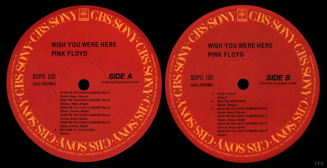 Back Cover: On the back cover, it says " C 1975 Pink Floyd Limited / P 1975 Pink Floyd Music Limited / Manufactured by CBS / Sony Hong Kong Ltd. Trademarks of CBS Inc. and Sony Corp. / Licensee CBS / Sony Inc. (kp)."