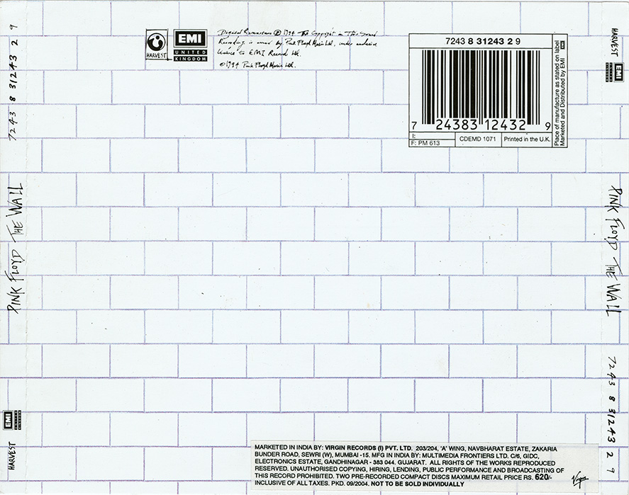 Back Cover: White brick wall. In the top right corner is the bar code box. At top center is the Harvest and EMI logos. At the bottom is a white rectangular Virgin Records India sticker with Indian credits.
