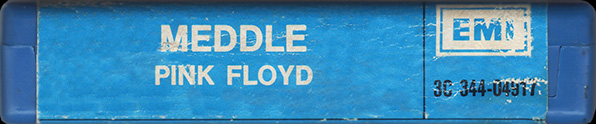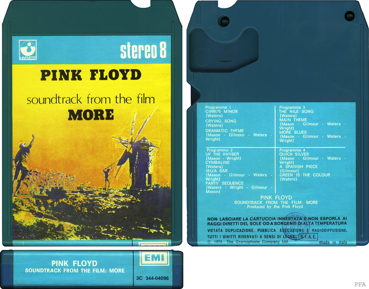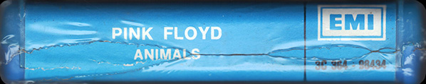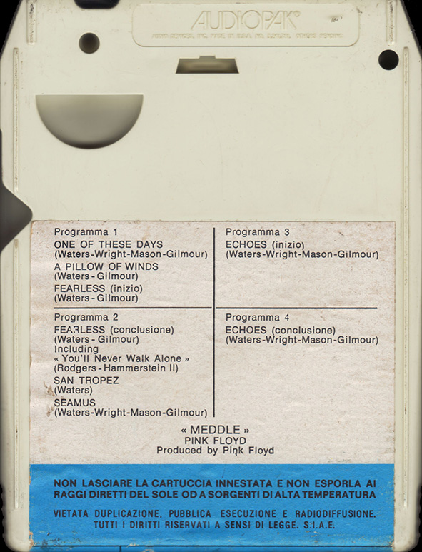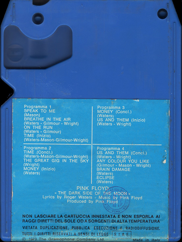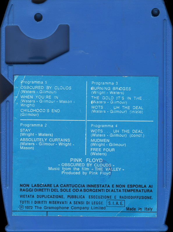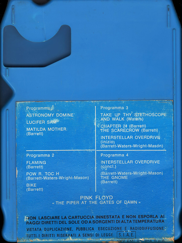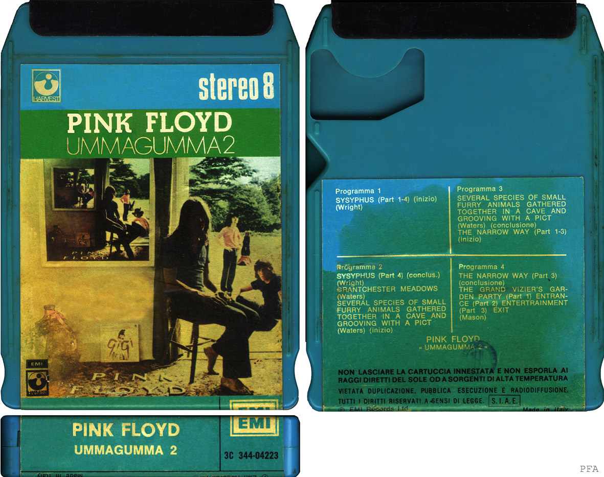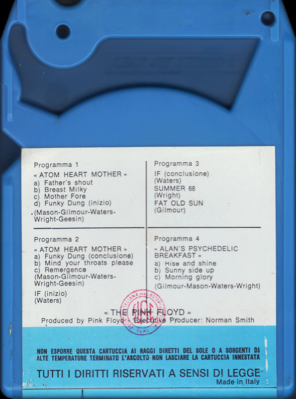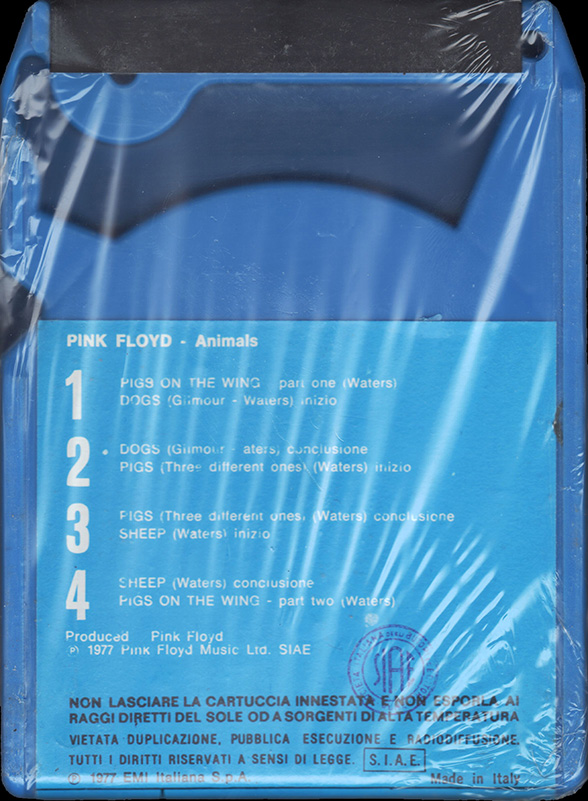 Tape #1: [front / back / spine] Blue EMI cart. Title. Pig over Battersea. Harvest logo and "Stereo 8" in white. Spine and back cover are blue. Song listing on the back. "Made In Italy."