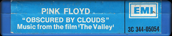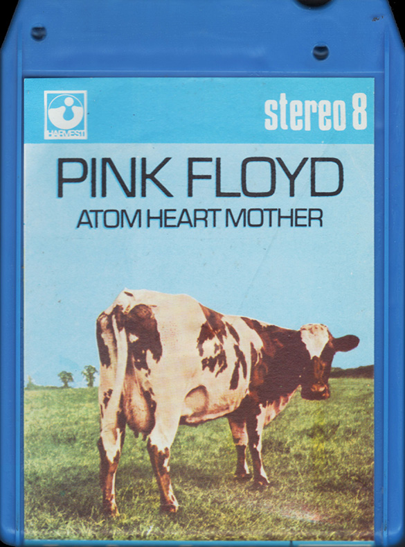 Tape #1: [front / back / spine] Blue cart. Title. A cow. Harvest logo and "Stereo 8" in white. "EMI" imprinted on back of case. Spine is mislabeled "Atom Heart Mothers."