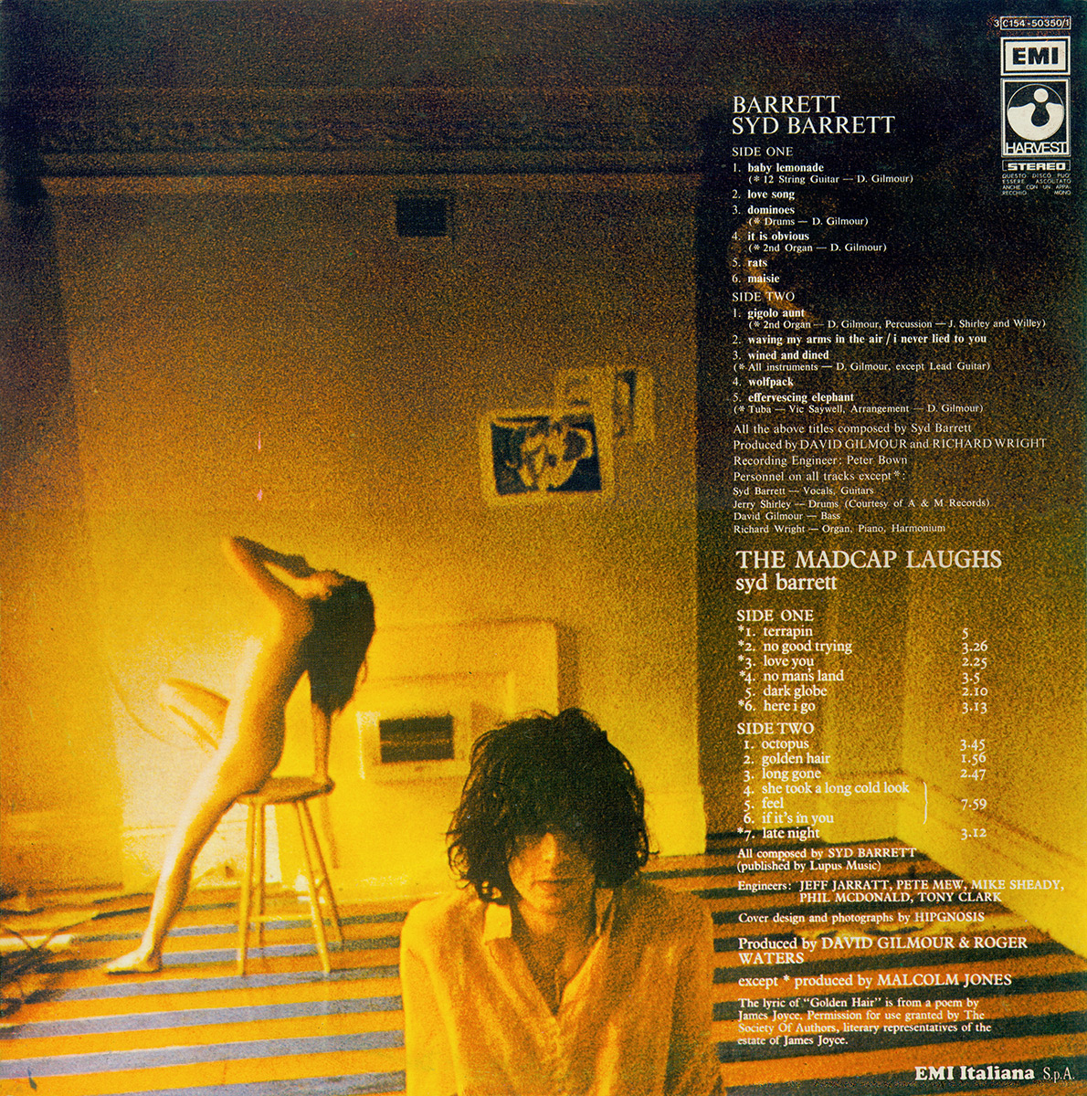 Back Cover: A picture of Syd Barrett with the song titles and credits printed on a gold background down the right side.