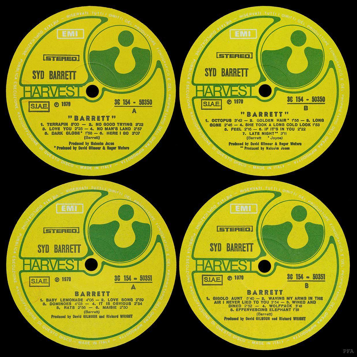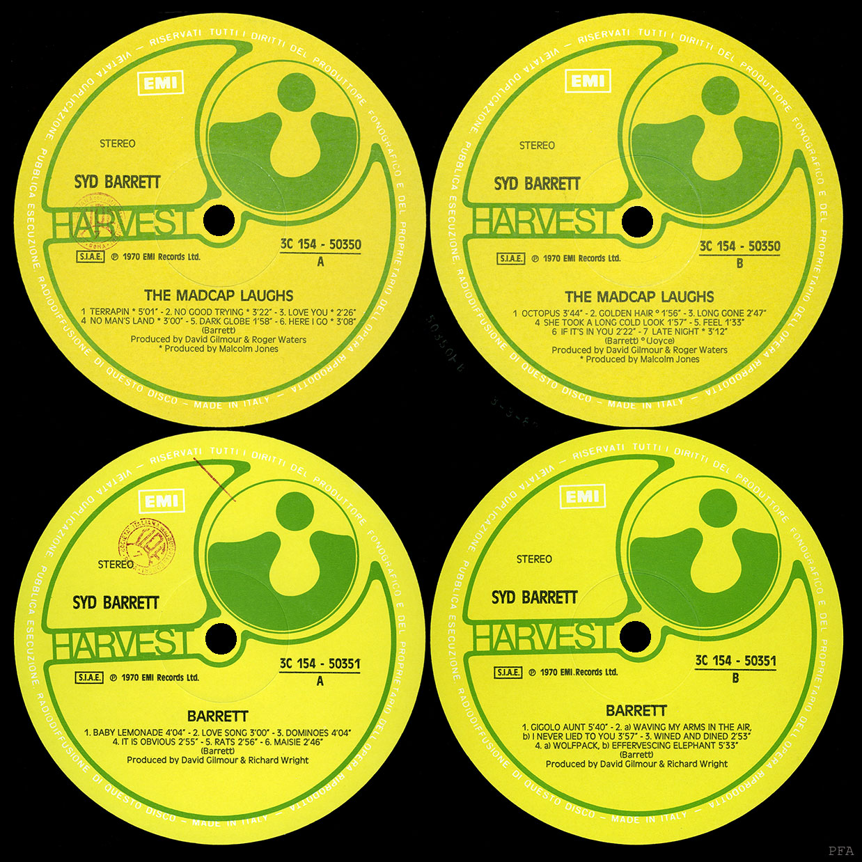 Cover Sticker: On some releases, there was a round yellow and red sticker that said "2 Dischi A Prezzo Speciale, Syd Barrett con David Gilmour, Richard Wright dei Pink Floyd."