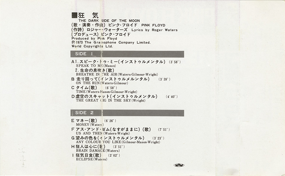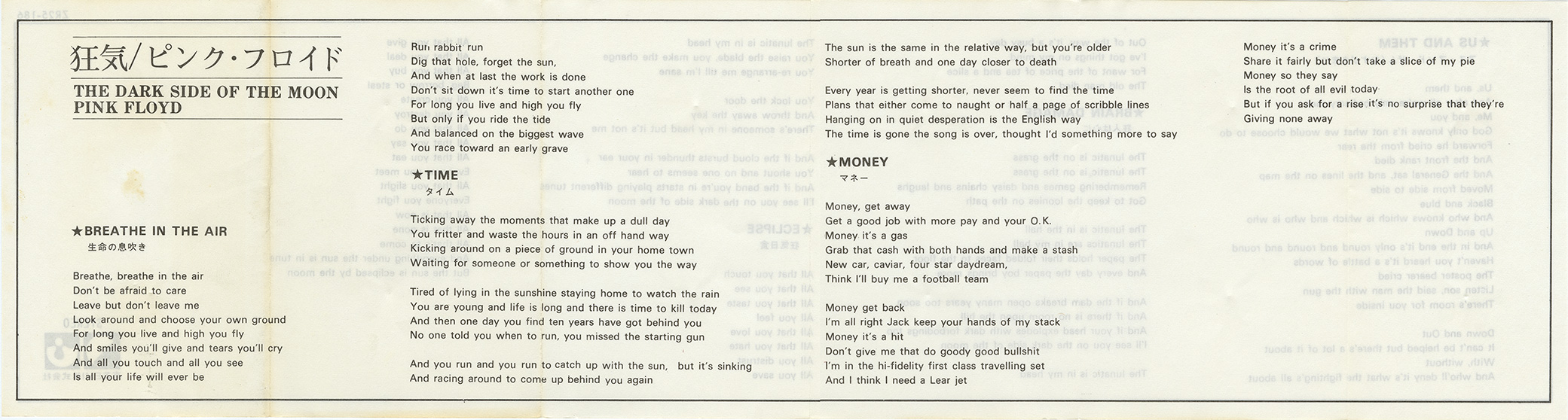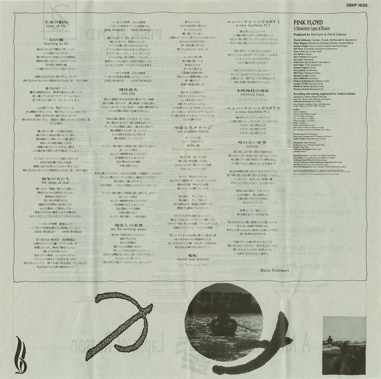 Insert: [front] [back] Two sided grey fold-open insert. Includes album title, catalog number, song titles in English and Japanese, song timings, song lyrics in English and Japanese, and two essays about Pink Floyd written in Japanese.