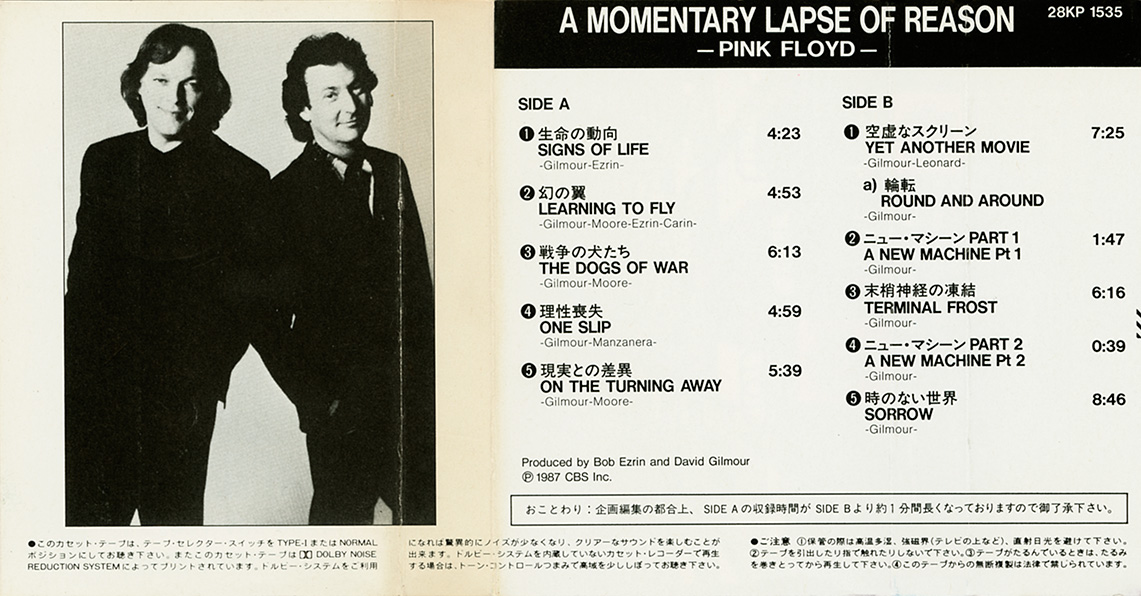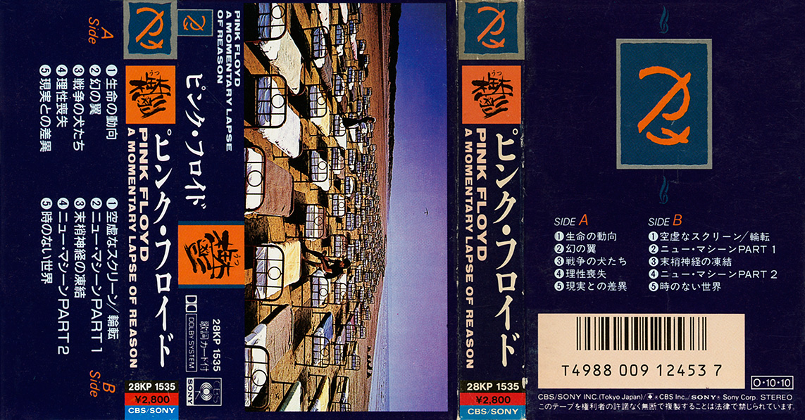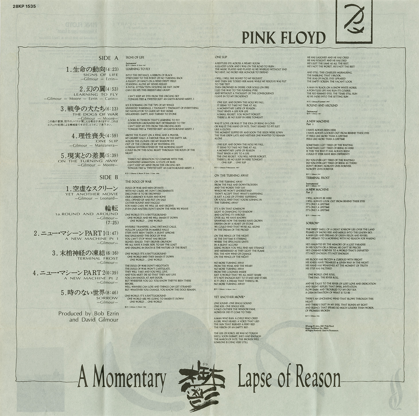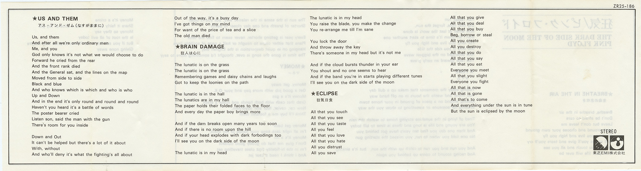 Insert: [front] [back] Two sided grey fold-open insert. Includes album title, catalog number, song titles in English and Japanese, song timings, song lyrics in English and Japanese, and two essays about Pink Floyd written in Japanese.