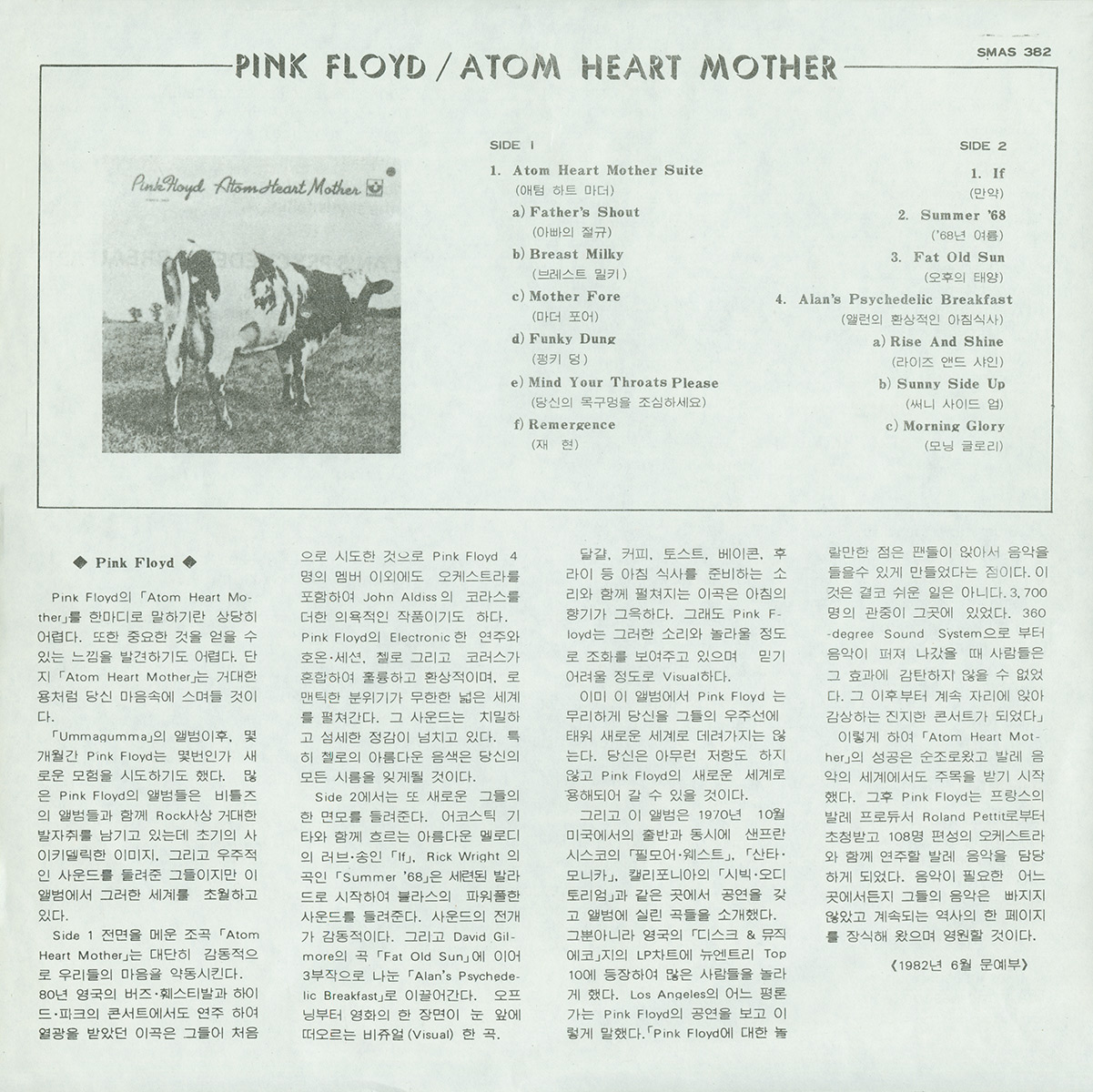 Release Information: Manufactured by Capitol Records. Issued with an insert with English and Korean lyrics. Side 1 label says "F athers Shout," "Breast Milky," "Mother Fore," and "Funky Dung." Side 2 label says "Summer," and "Morning Glogr."