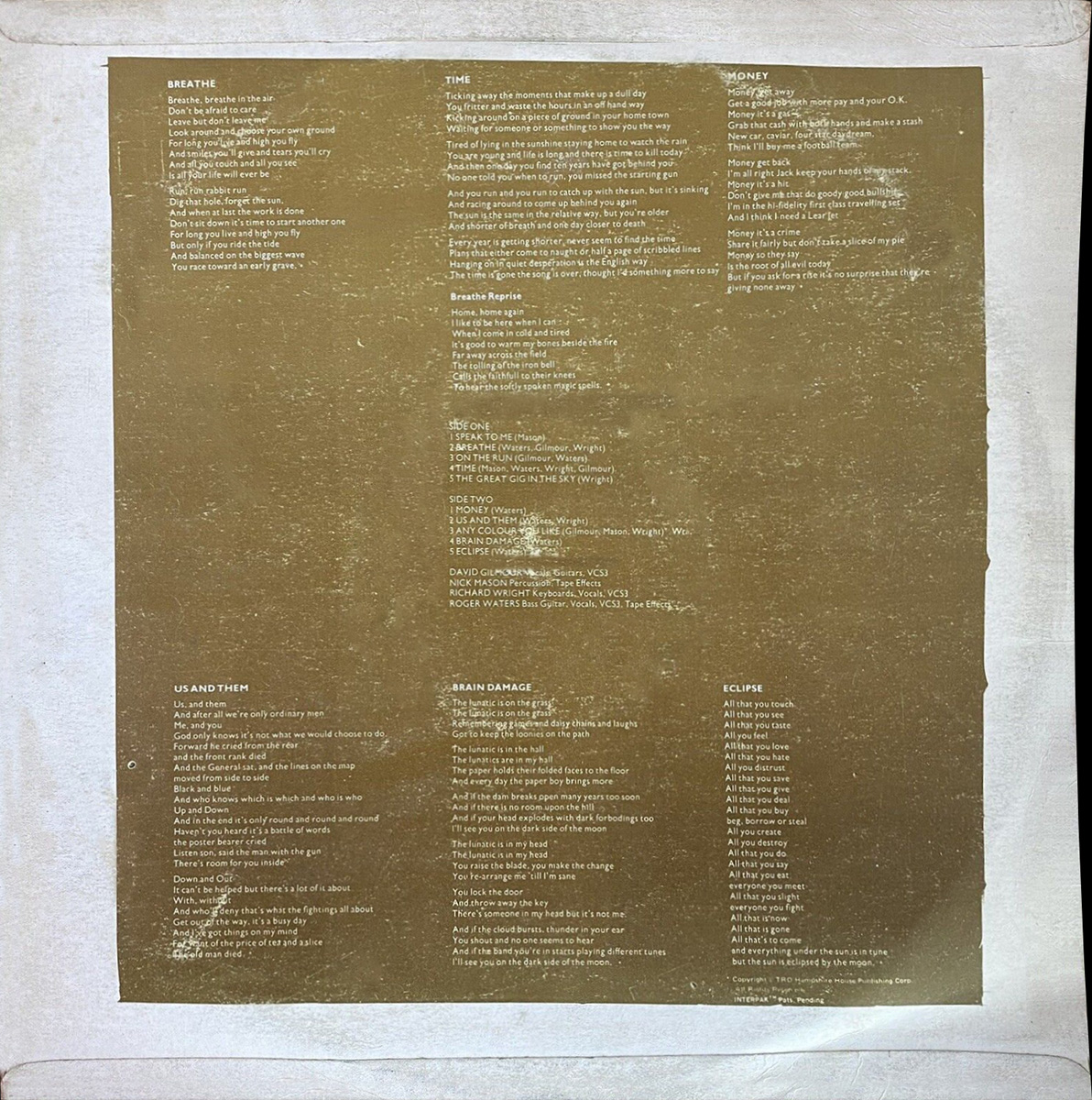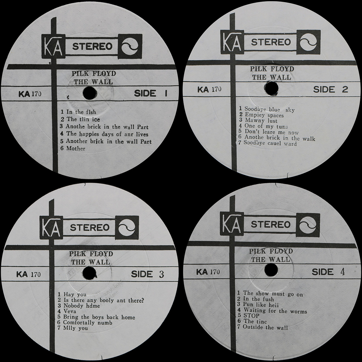 Release Information: Side l label reads "In The Fish," and "The Tlin Ice." Side 2 label reads "Sood Bye Blue Sky," "Empiey Spaces," "Hauny Lust," "One Of My Tuns," "Don't Leare Me Now," and "Sood Bye Cauel Ward." Side 3 reads "Hay You," "Is There Any Booly Ant There?," "Nobody Hdine," "Veva, " "Confortally Munb," and "Mlly You." Side 4 reads "In The Fush," "Pun Like Heii," and "The Tinc."