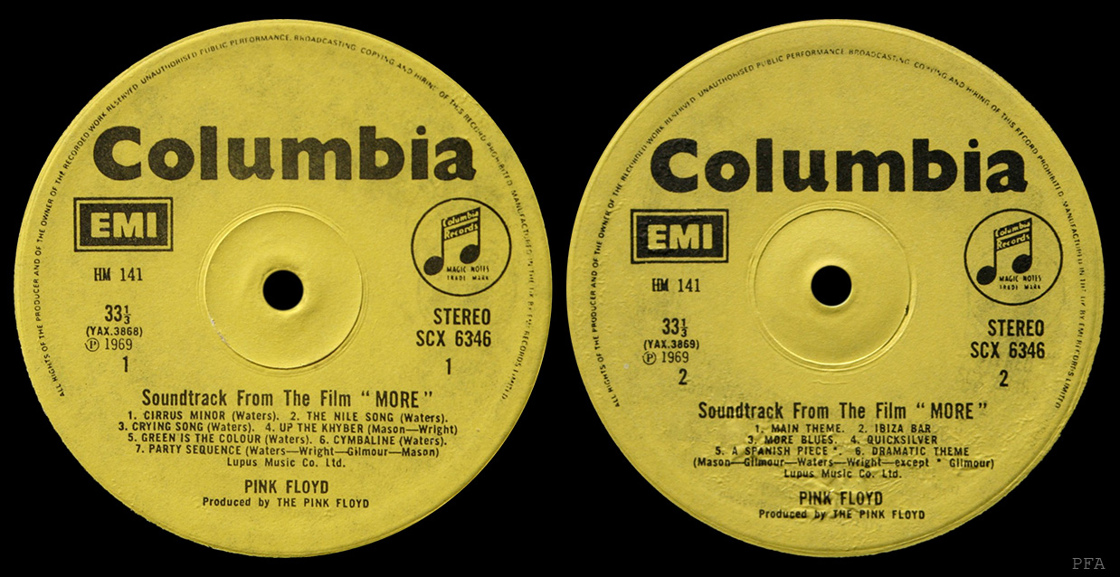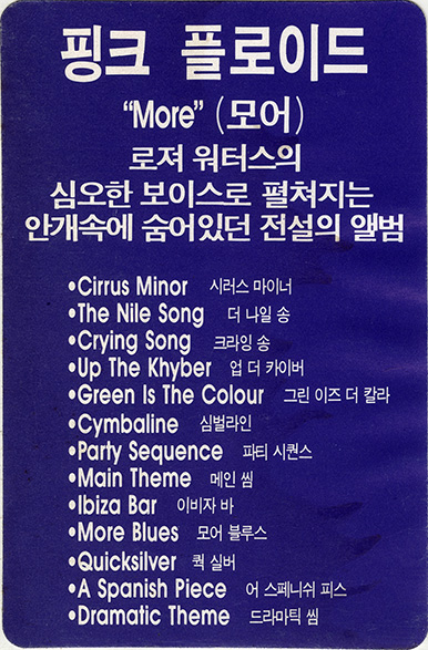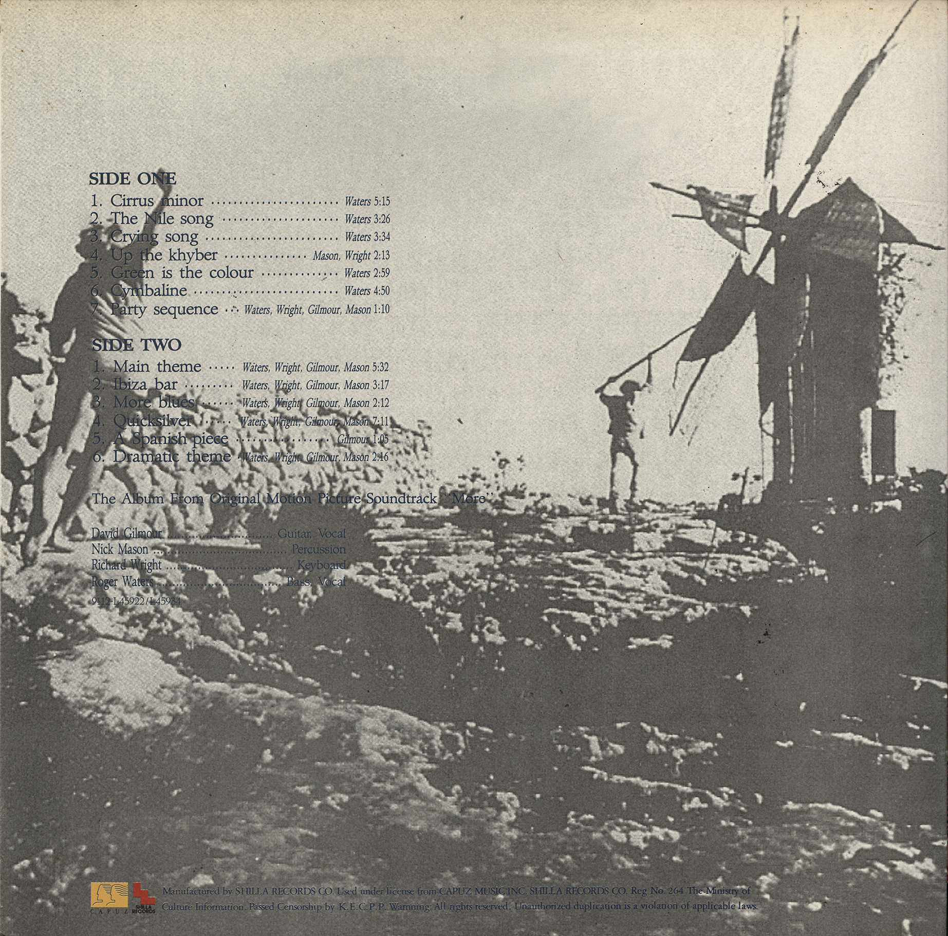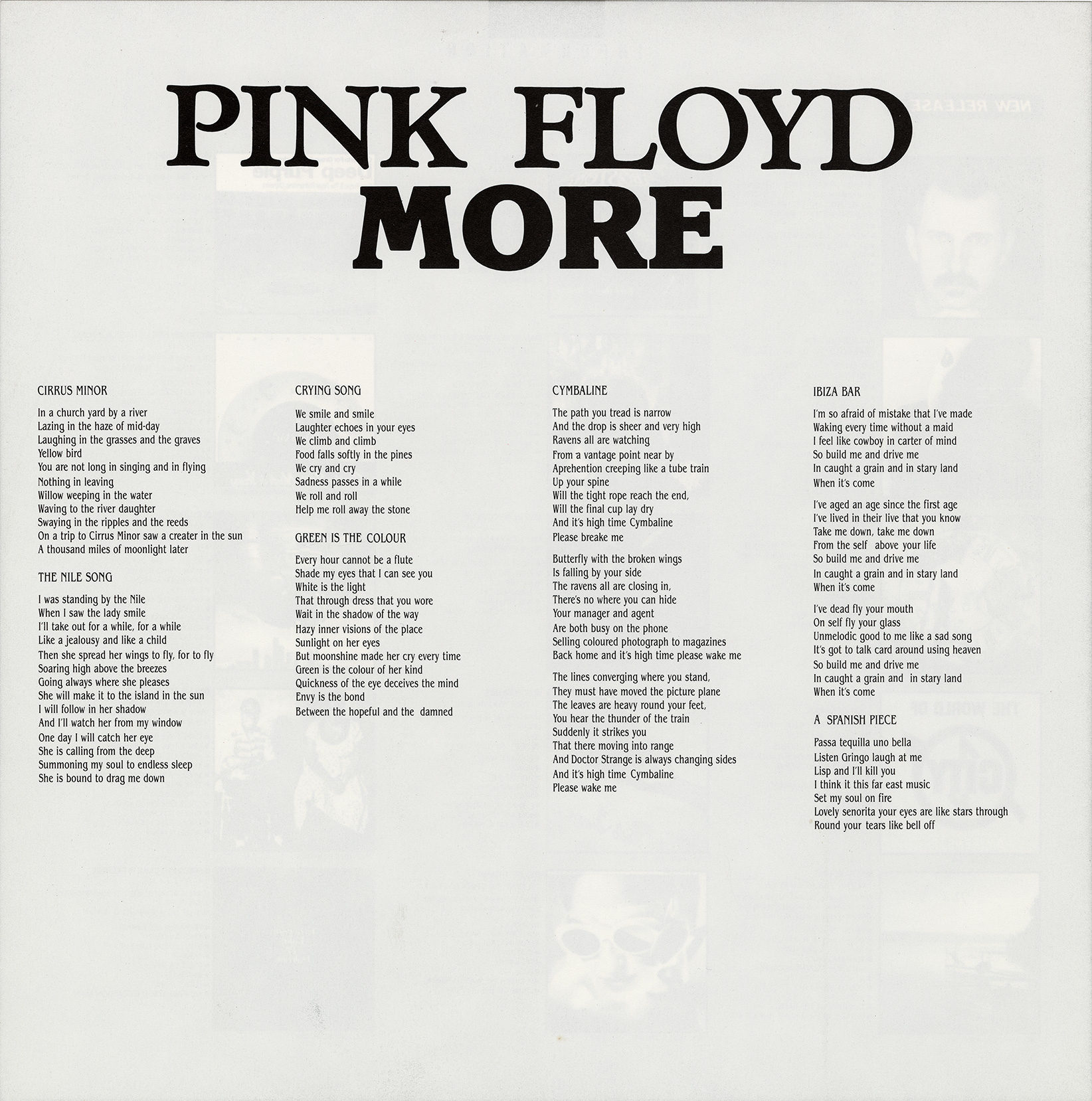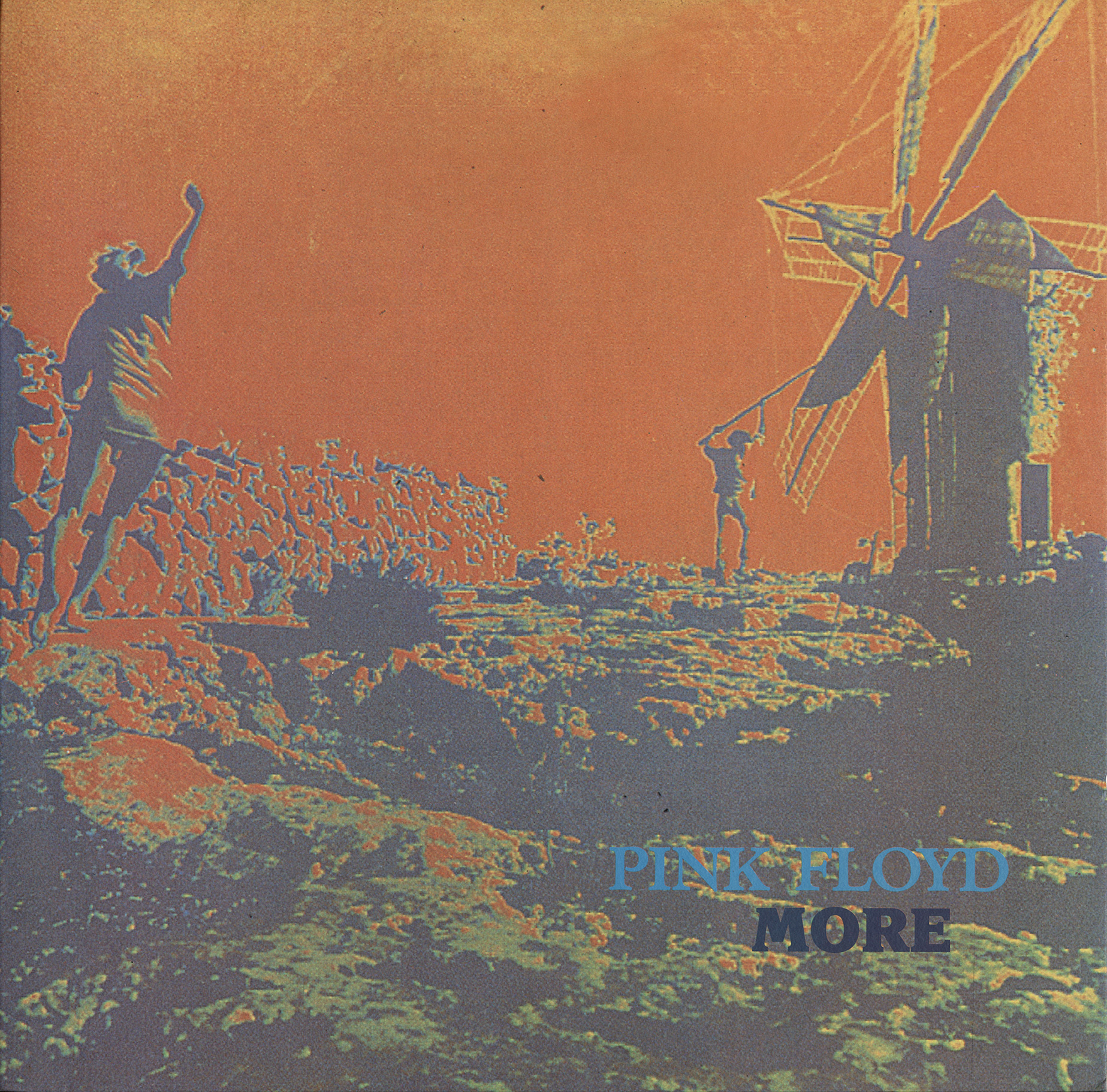 Front Cover: Scene from the movie. In the lower right corner in blue letters "PINK FLOYD," and in black letters "MORE." Matte.