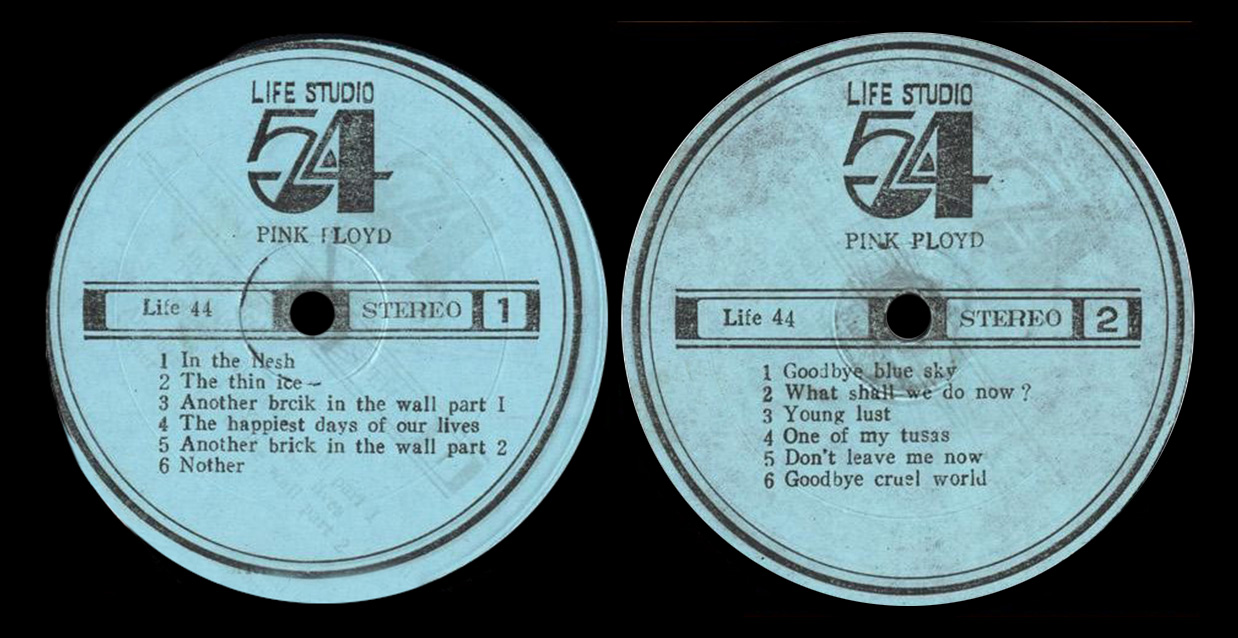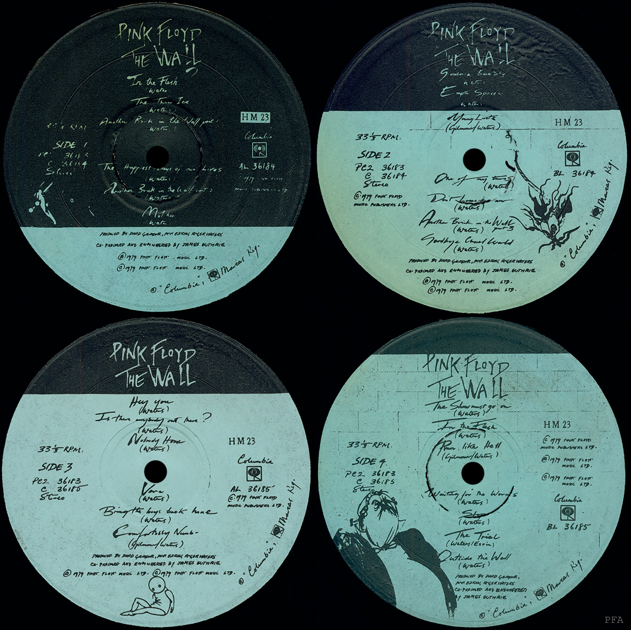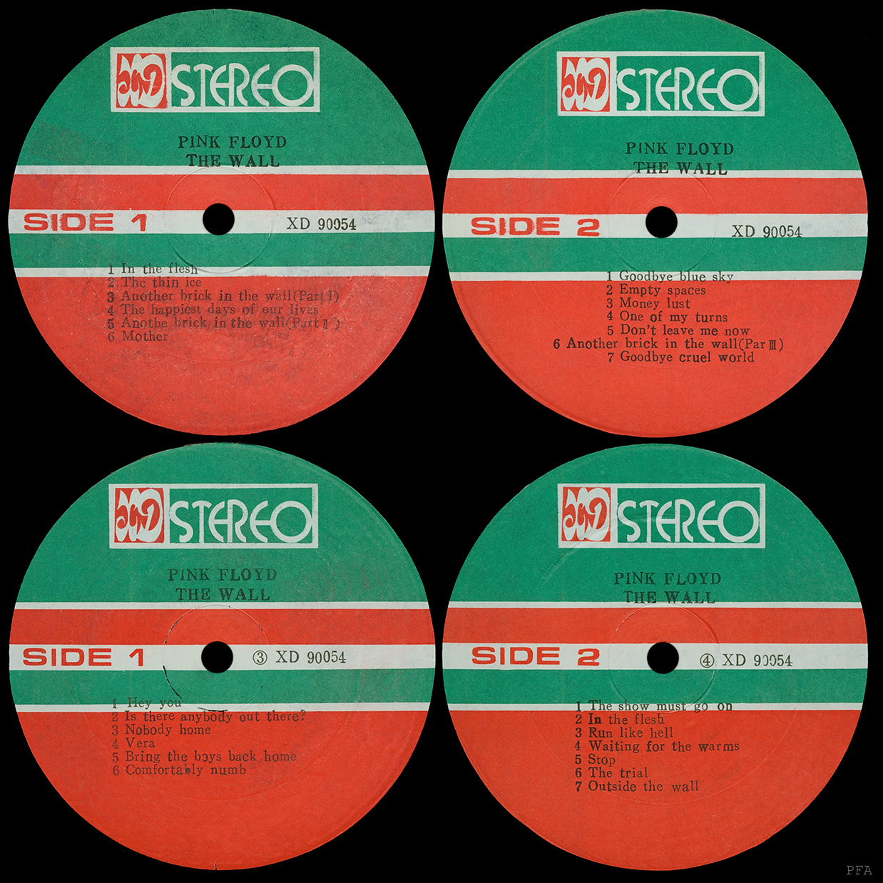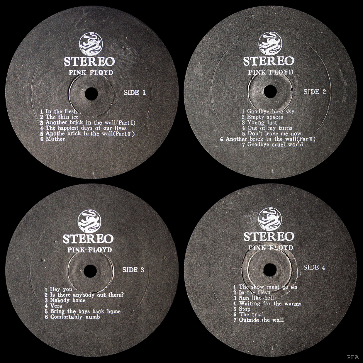 Release Information: Label #1 lists the songs: Anothe Brick In The Wall (Part II), Money Lust, Another Brick In the Wall (Par III), and Waiting For The Warms.