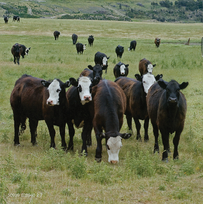 Back Cover: Three cows. Song listing. Credits. Bar code.