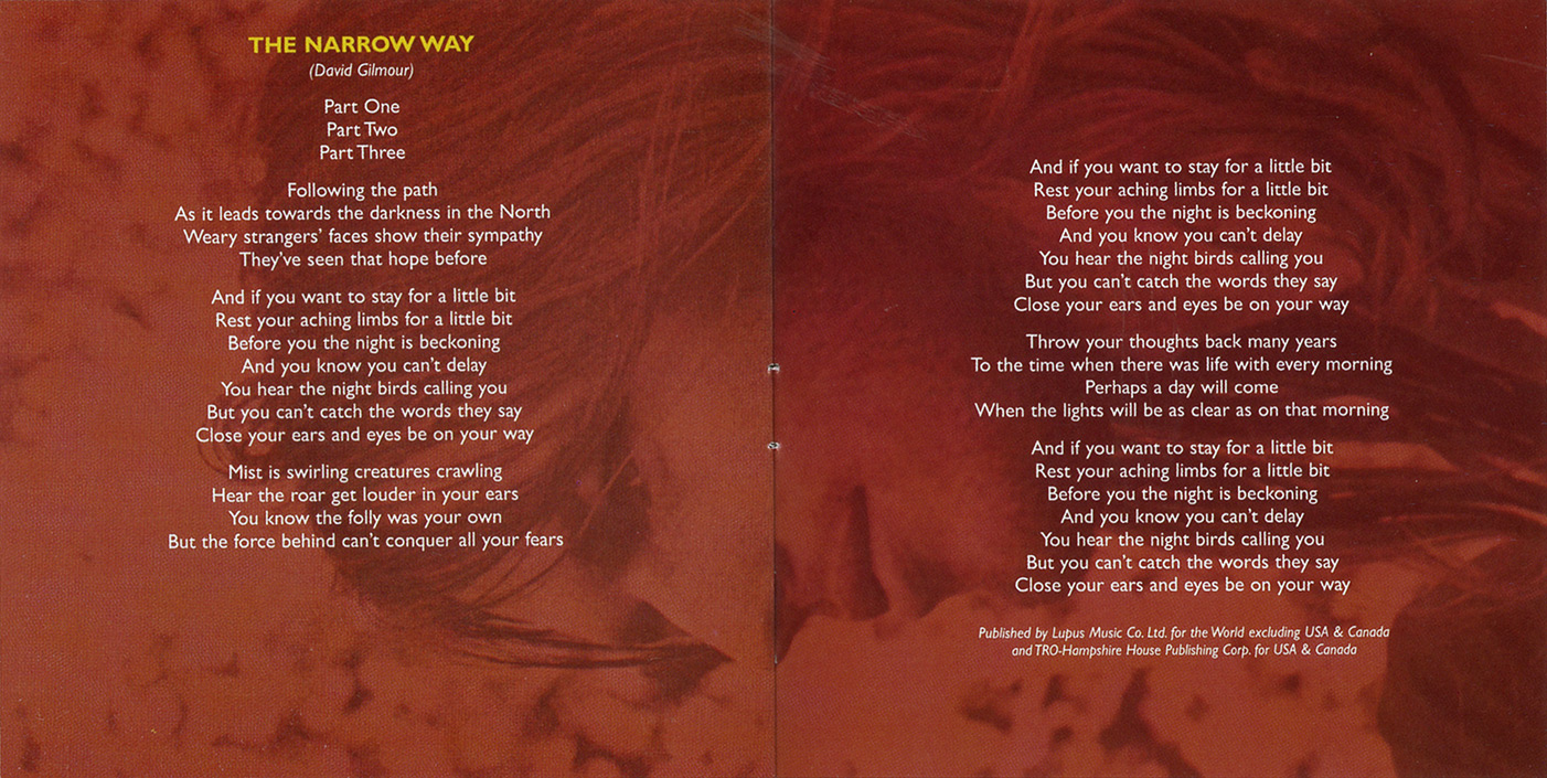 Booklet: [front] [2-3] [4-5] [6-7] [8-9] [10-11] [12-13] [14-15] [16-17] [18-19] [20-21] [22-23] [24-25] [26-27] [back] 28 page booklet lyrics, pictures and credits.