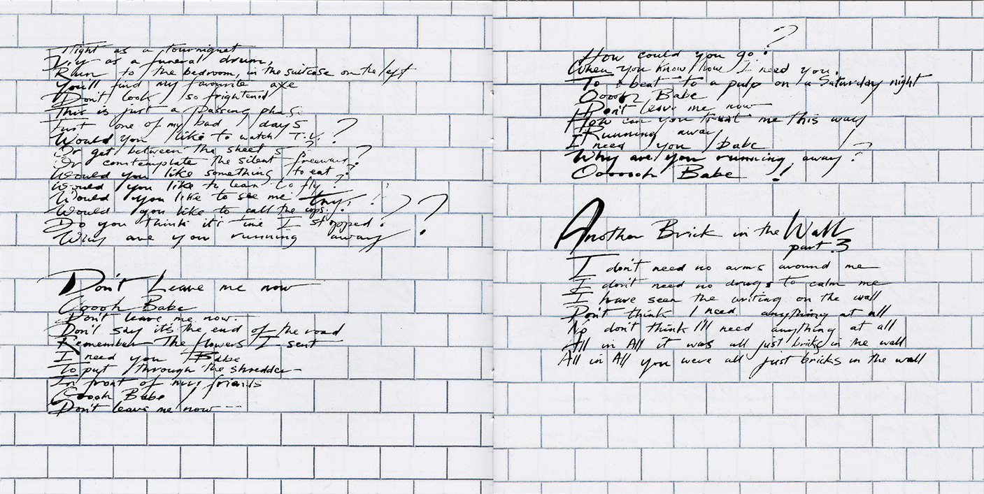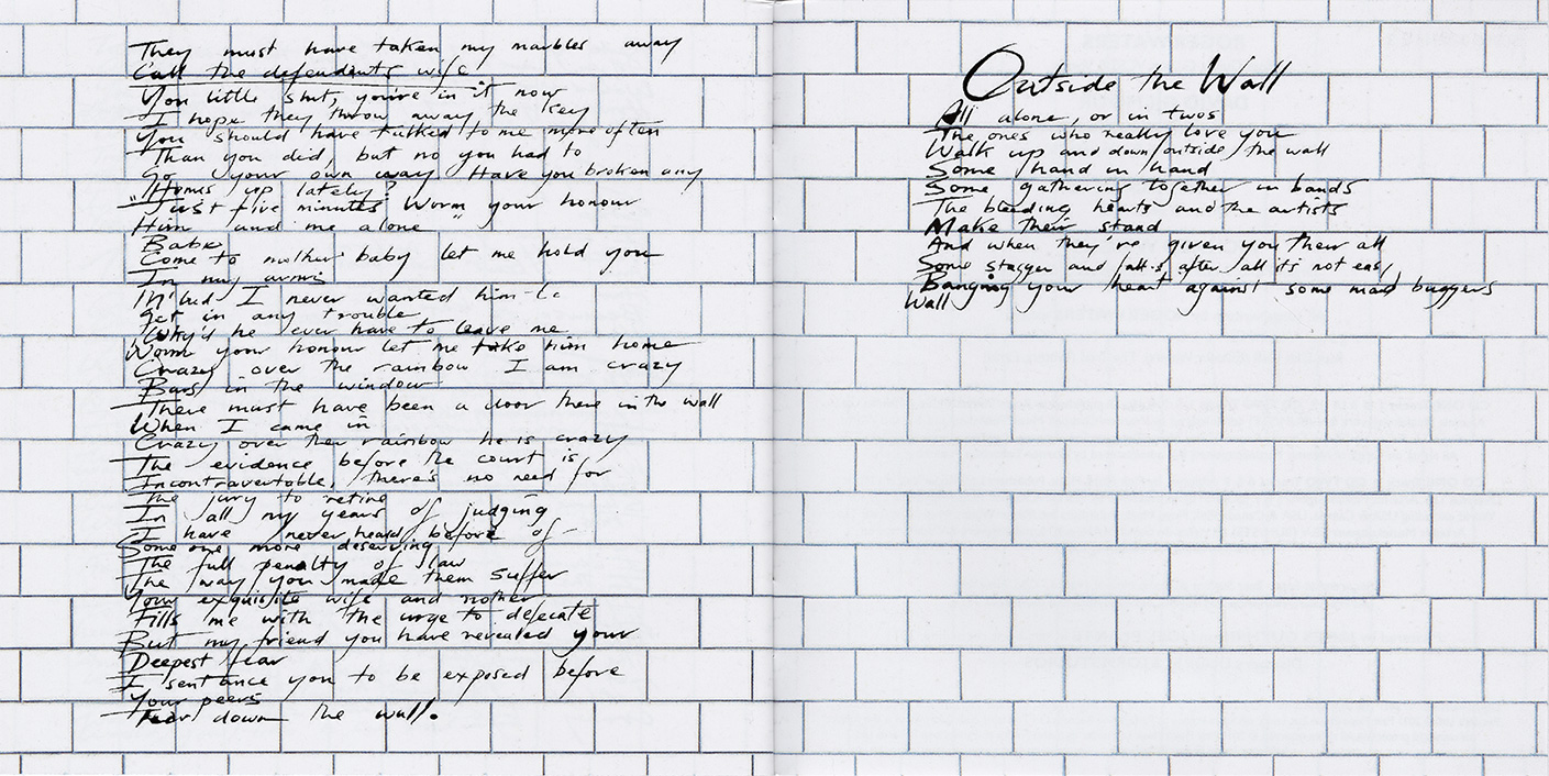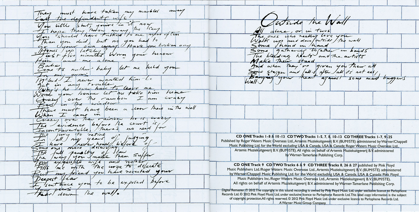 Inside Cover: White brick wall and Scarfe characters.
