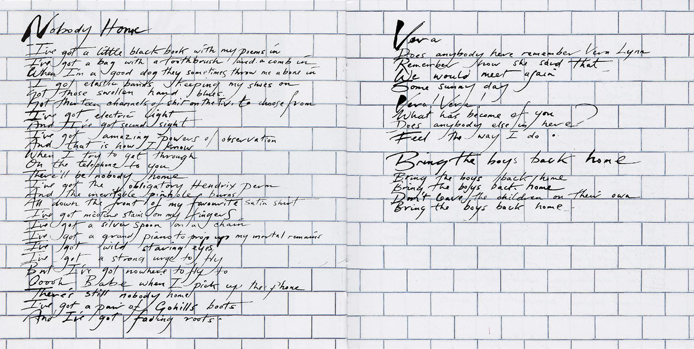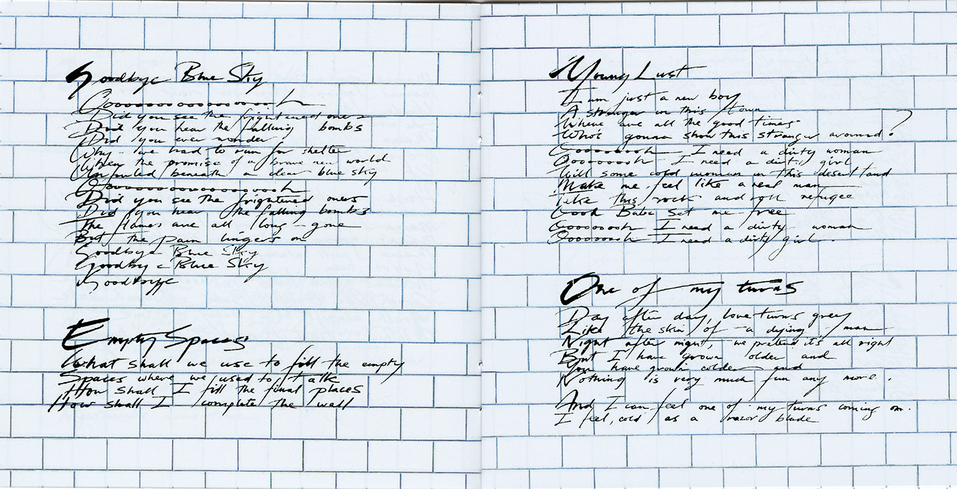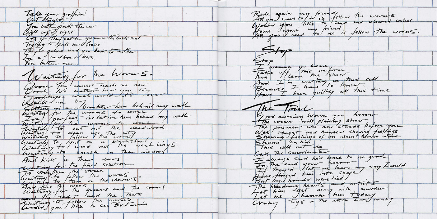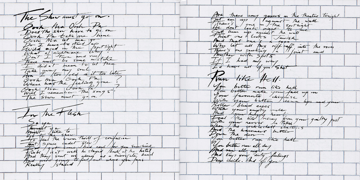 Inside Cover: White brick wall and Scarfe characters.