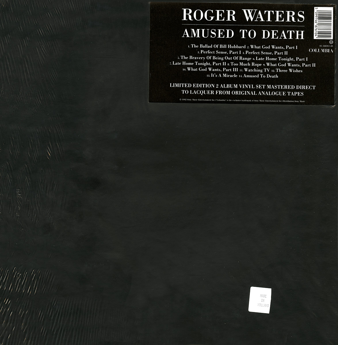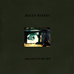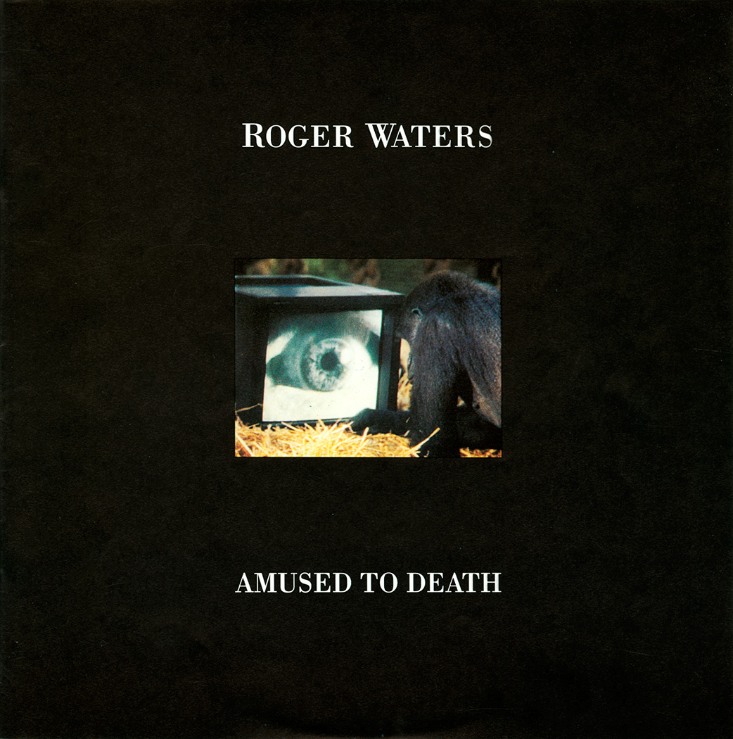 Front Cover: Black cover with a picture of a monkey watching TV in the center, and the words "Roger Waters" in black above the picture, and the words "Amused to Death" in black below the picture.