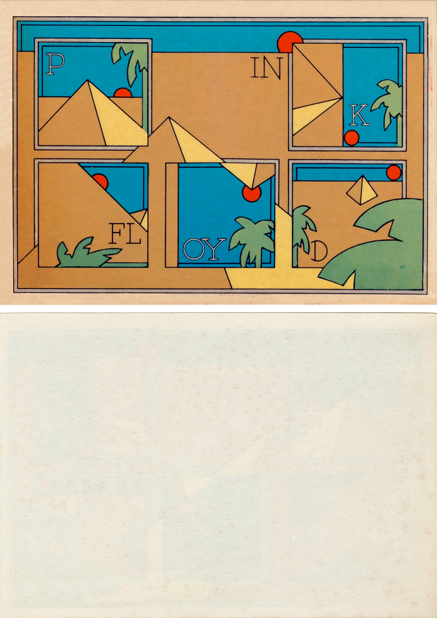 Down the center of the postcard it says "Album sleeve insert for Pink Floyd. Wish You Were Here. Harvest, EMI Records 8E 07286918."