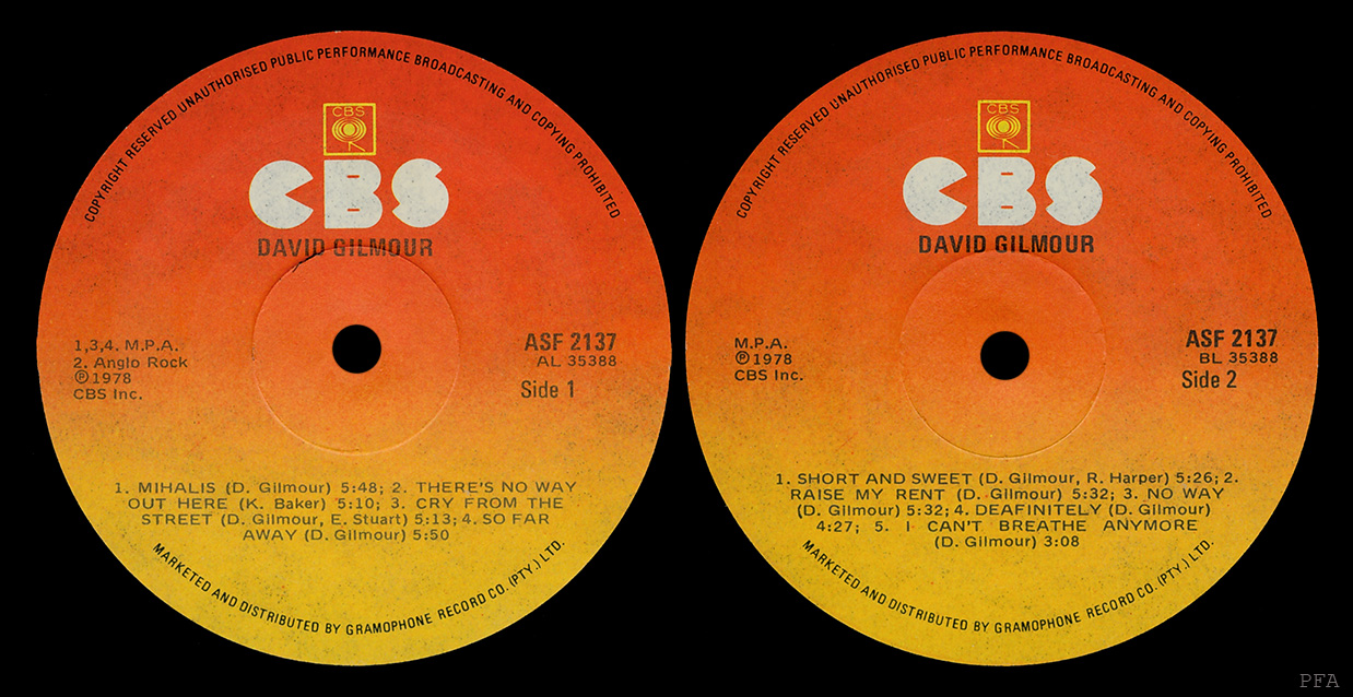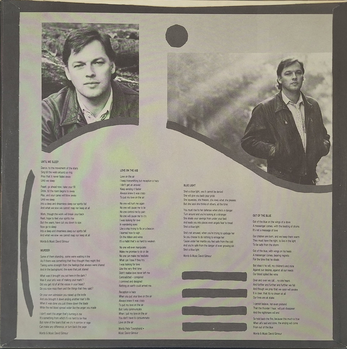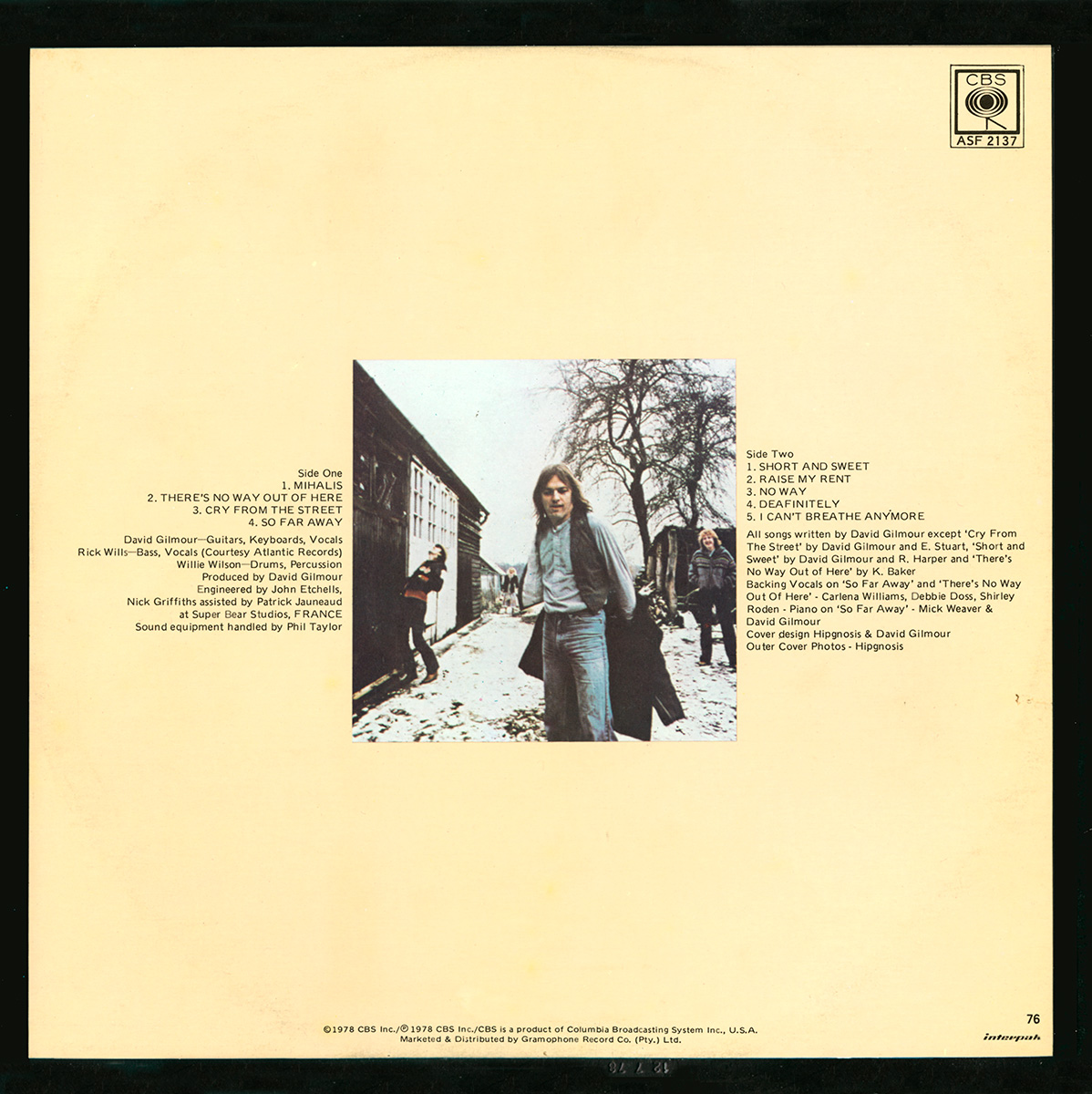 Back Cover: David Gilmour. Song listing. Credits. In the lower right corner, it says "Artone Press."