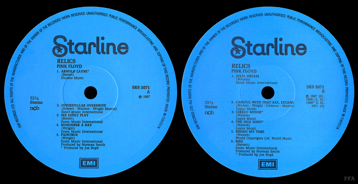 Label #2: Blue Starline labels with no text around the edge, and the record company, rights reserved, and copying text printed to the left of the spindle hole.