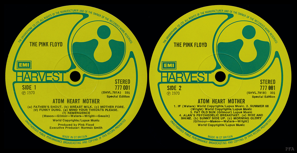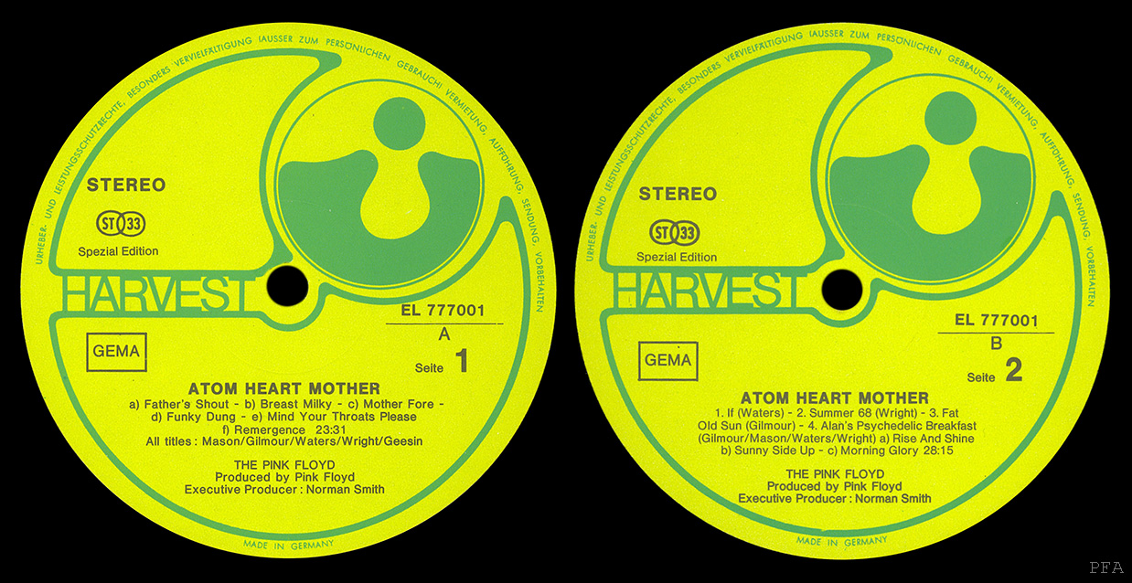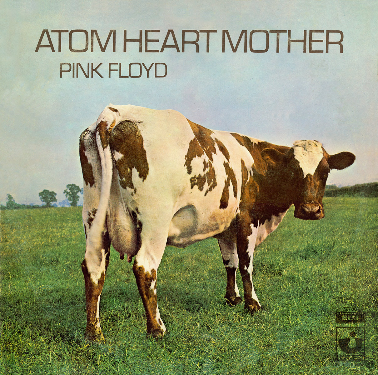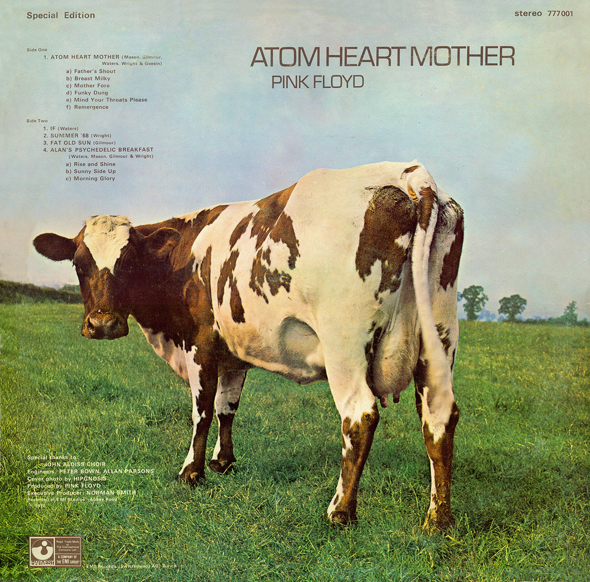 Back Cover: A cow. In the top left corner is the song listing and credits. In the top right corner. it says: ATOM HEART MOTHER PINK FLOYD, and the catalog number stereo 777001. In the lower left corner are the Harvest logo and EMI Records (Switzerland) AG Z rich.
