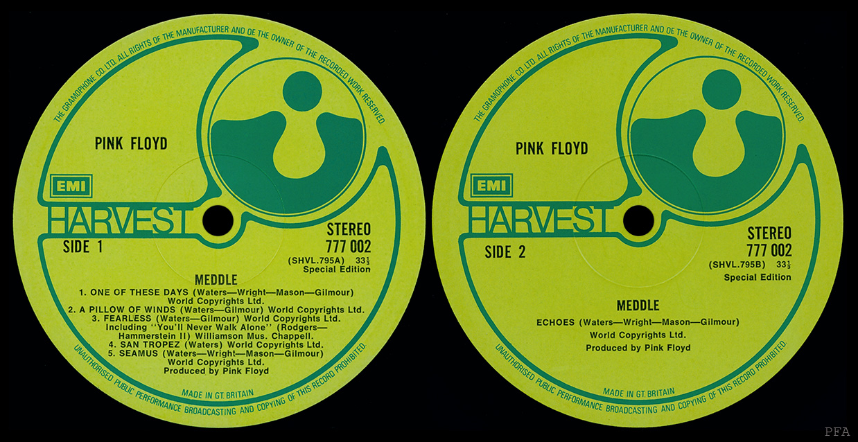 Front Cover: Soundwaves on an ear. Title. In the top left corner is the catalog number 777002 Special Edition, with a black border. In the lower left corner is the EMI/Harvest logo. In the lower right corner, it says: Pink Floyd MEDDLE. Matte.