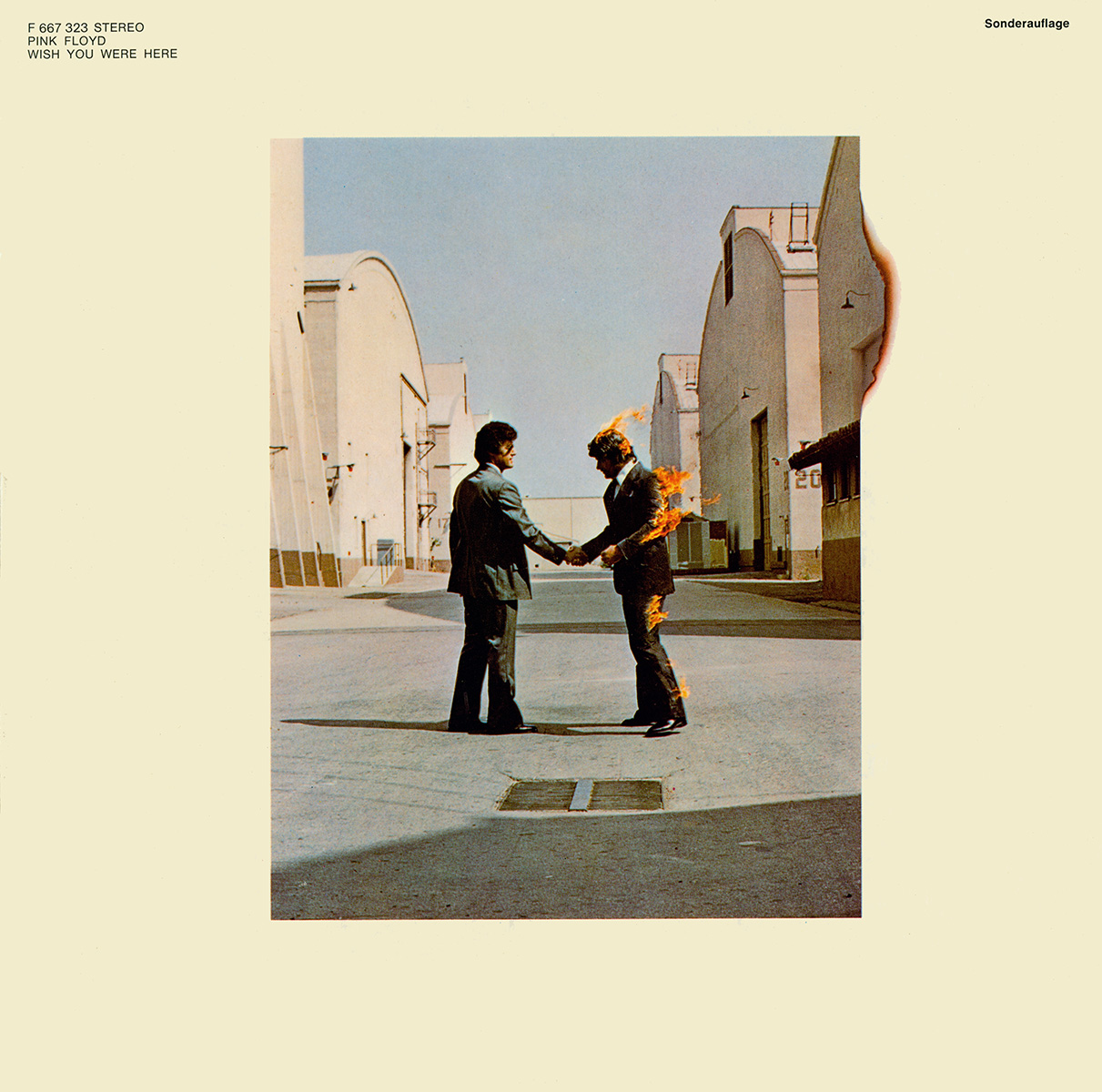 Front Cover: Burning man leaning forward. Laminated. In the top left corner it says "F 667 323 STEREO, PINK FLOYD, WISH YOU WERE HERE." In the top right corner it says "Sonderauflage."