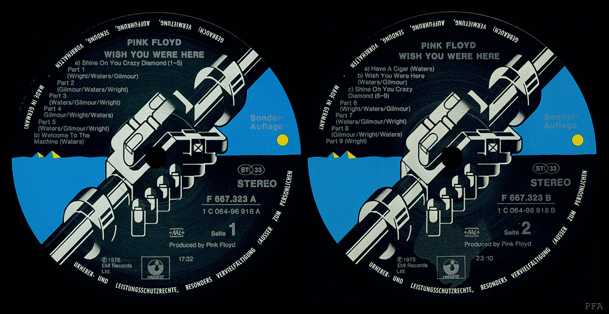 Back Cover: In the top right corner it says "STEREO F 667 323 PINK FLOYD WISH YOU WERE HERE P EMI Records Ltd." Laminated.