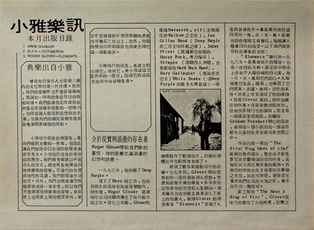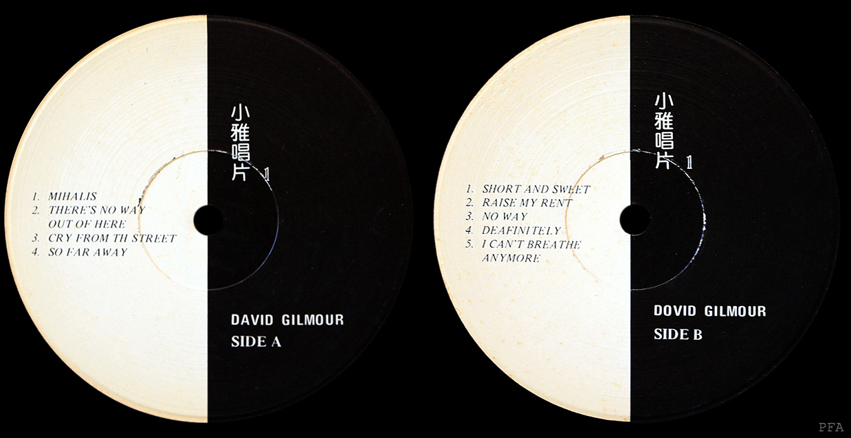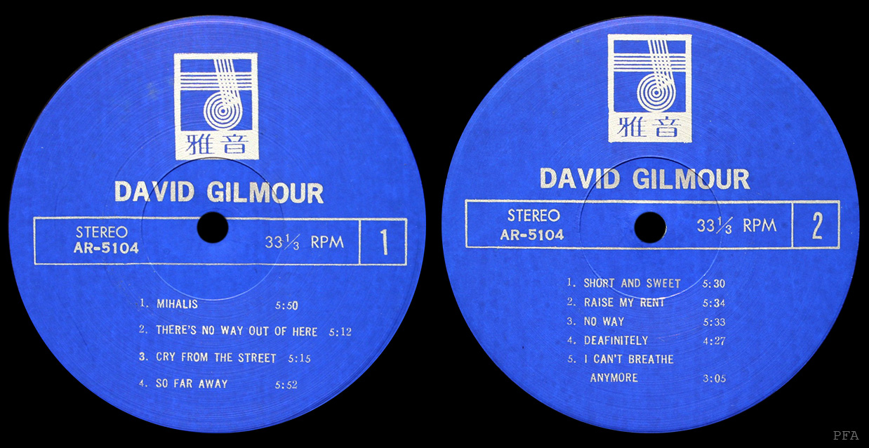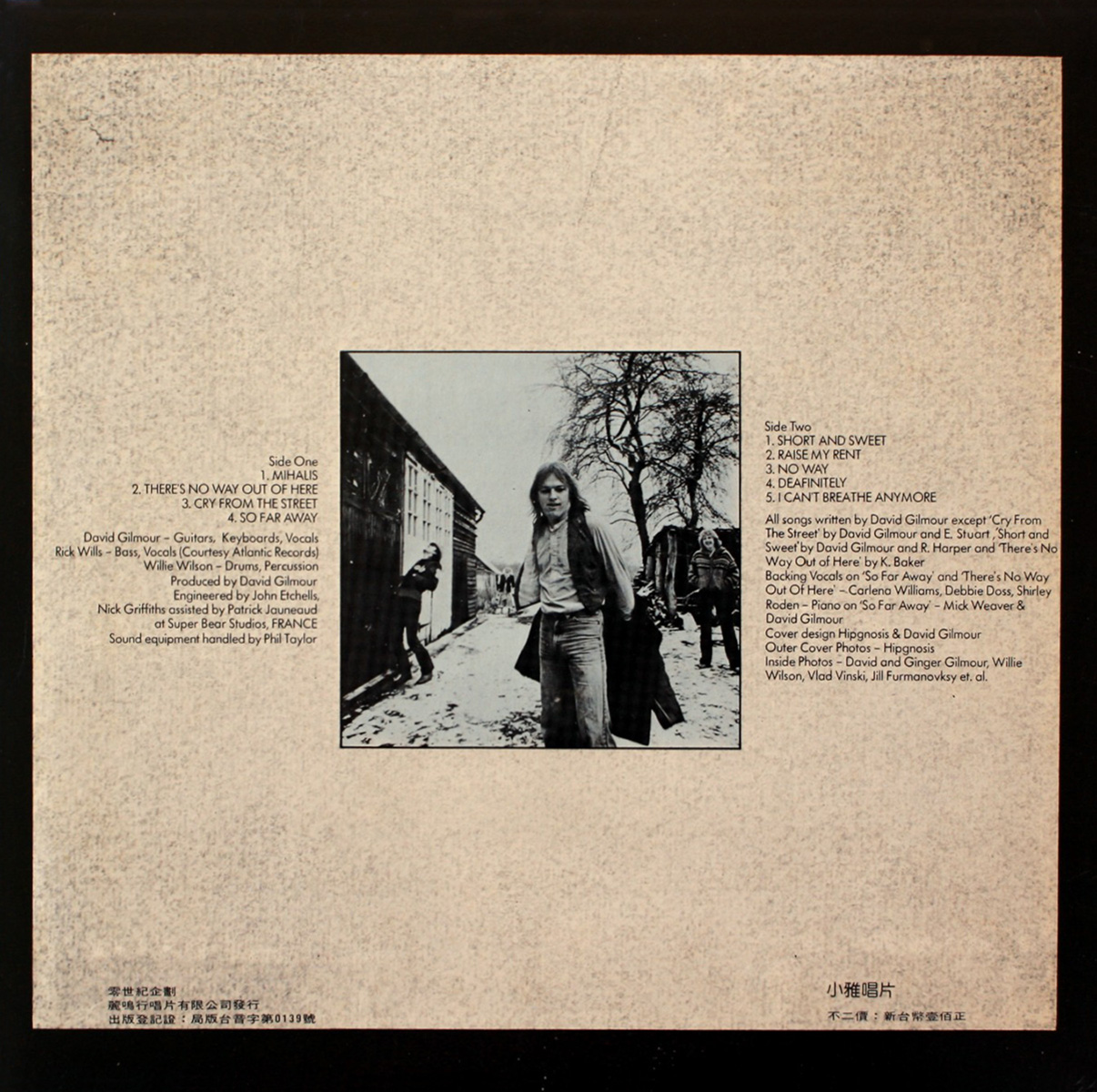 Release Information: Taiwanese issue. Chinese text on back cover and label. Misspelling "DOVID GILMOUR" on side B label.