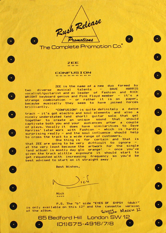 Release Information: 12" picture sleeve with opening for the record on the top. Extended version of the song Confusion. 45 rpm.
