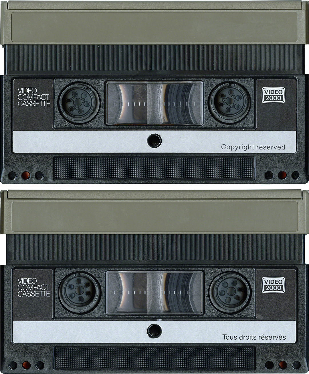 Video 2000 videotapes are different than VHS and Beta videotapes. These tapes, which were developed by Philips, featured a data track in addition to the video track, a unique DTF tracking mechanism, and dynamic noise suppression. V2000 tapes are played/recorded on both sides, requiring you to flip the videotape to play each side. A special V2000 playback device is required to play these tapes.