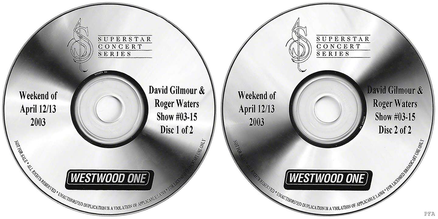 Release Information: A two CD radio show featuring Pink Floyd live at Knebworth 1990, and Roger Waters live in Quebec 1987. Cue sheets.