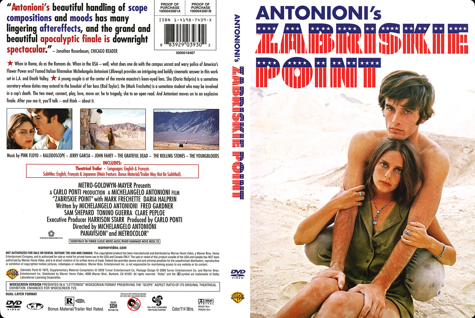 Release Information: A Michelangelo Antonioni film. Starring Mark Frechette, Daria Halprin and Rod Taylor. Written by Michelangelo Antonioni, Fred Gardner, Sam Shepard, Tonino Guerra and Clare Pepole. Executive producer Harrison Starr. Produced by Carlo Ponti. Directed by Michelangelo Antonioni. Original music composed and performed by Pink Floyd.