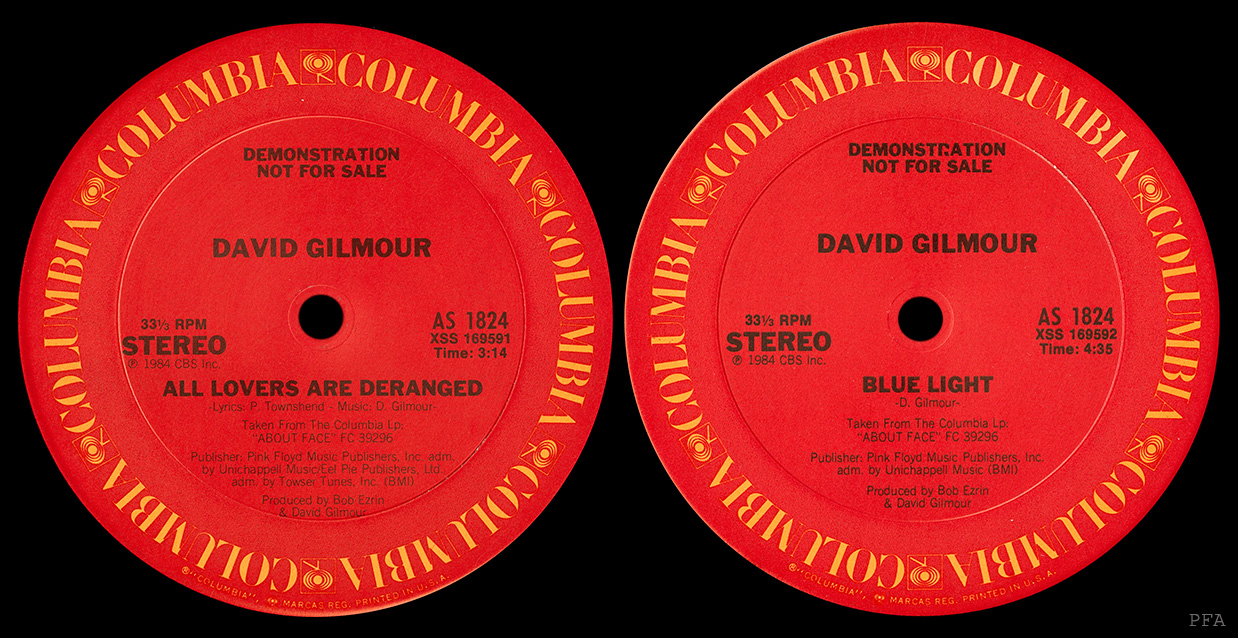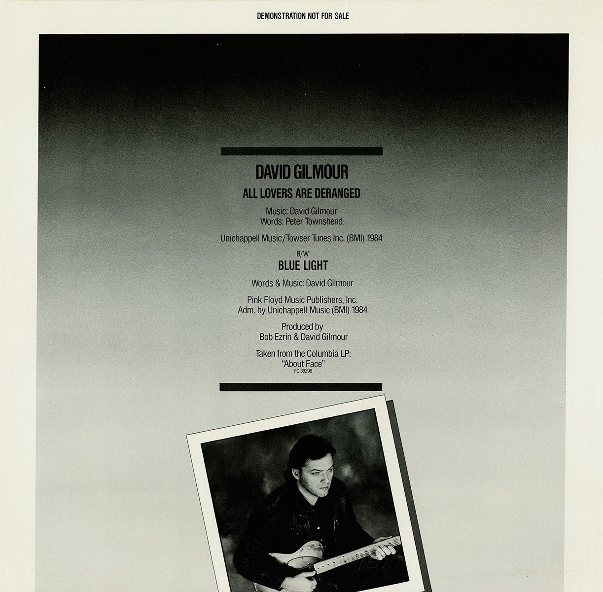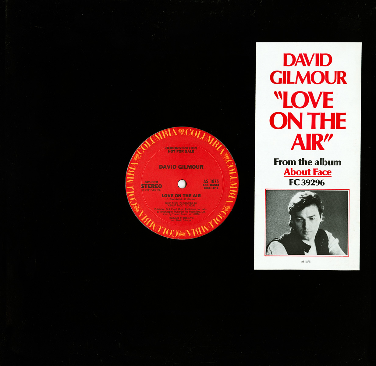 Cover Sticker: White with a picture of David Gilmour and text that says: David Gilmour "Love On The Air" From the album About Face FC 39296 AS 1875.