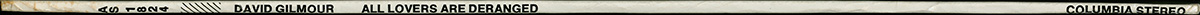 Test Pressing: A one-sided test pressing was made of All Lovers Are Deranged. The 12-inch acetate was cut on January 19, 1984 by The Mastering Lab in Los Angeles, California, on behalf of Columbia Records. White Mastering Lab label with song, date and artist typed in, as well as the words "Stereo Ref." White The Mastering Lab cover.