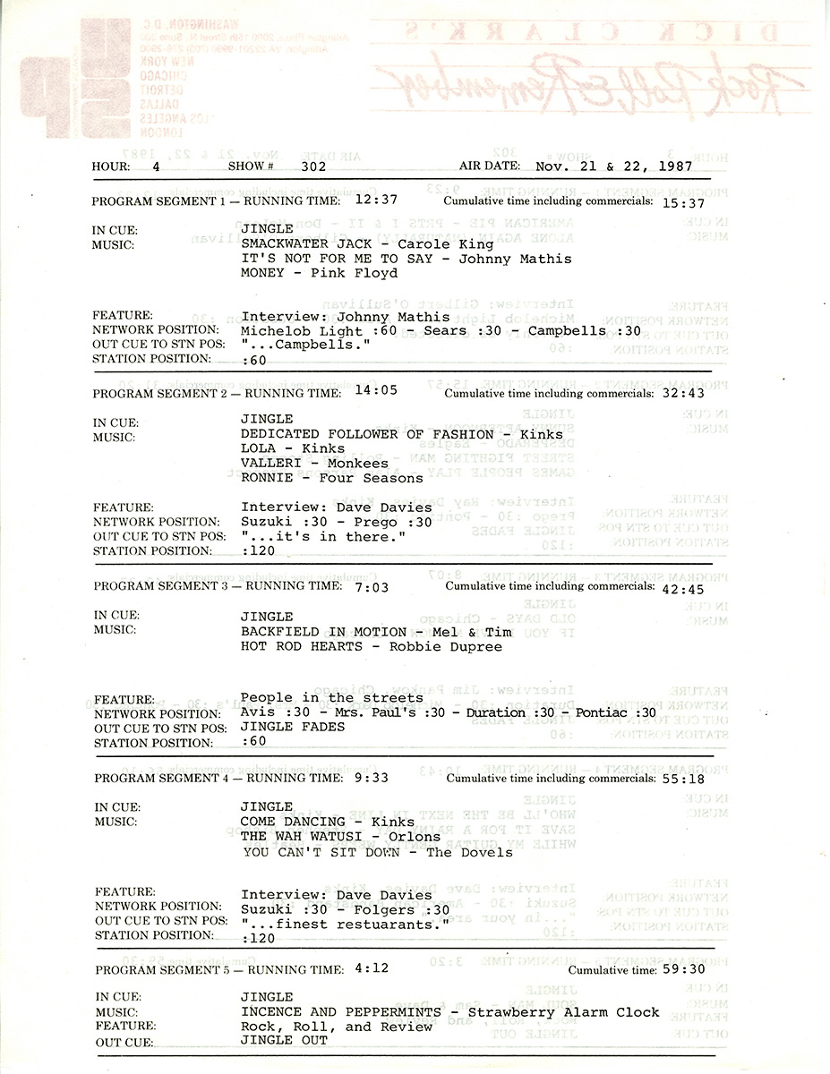 Release Information: A 4-LP radio show hosted by Dick Clark. Features the Pink Floyd song, Money. Also includes interviews with Ray and Dave Davies.