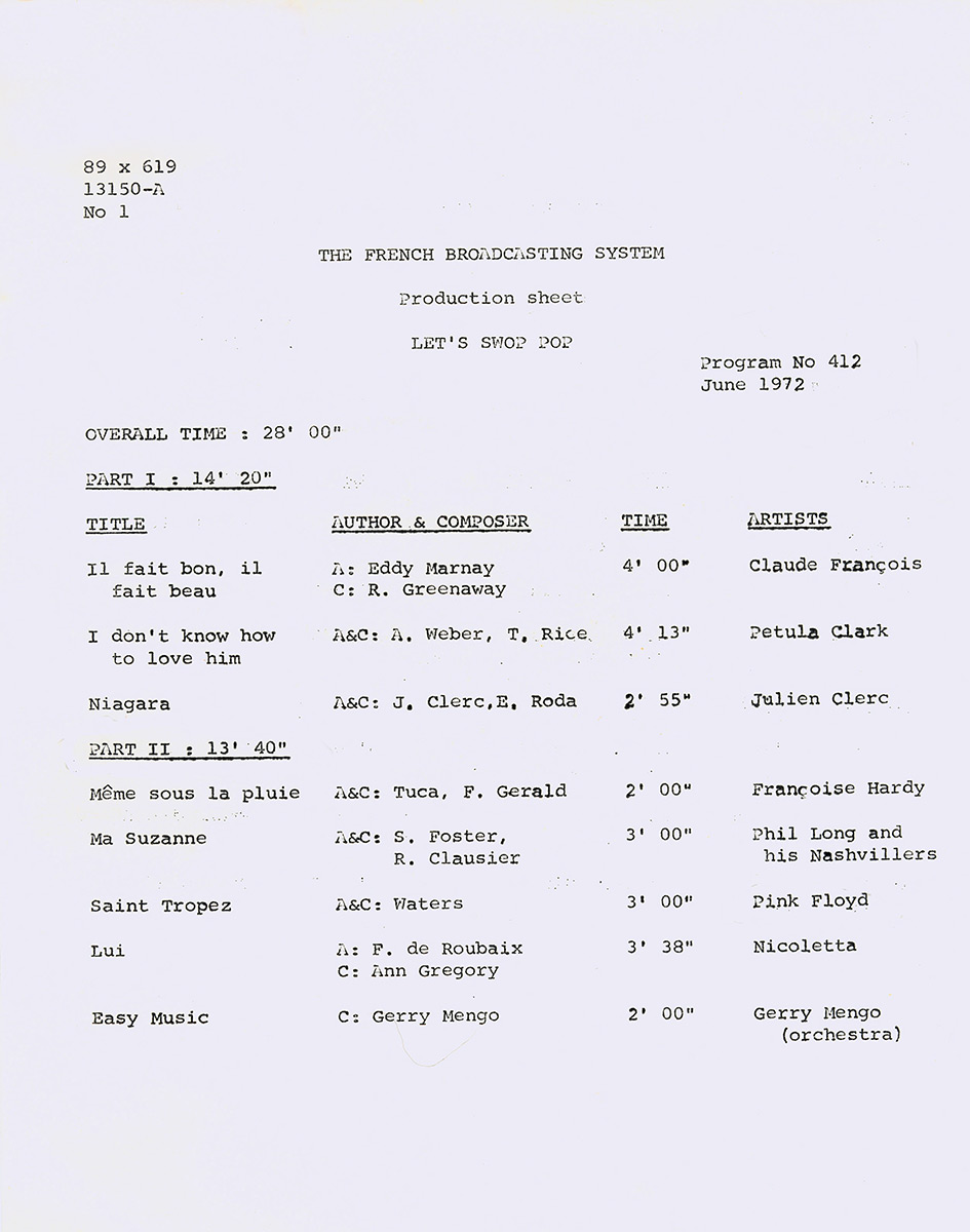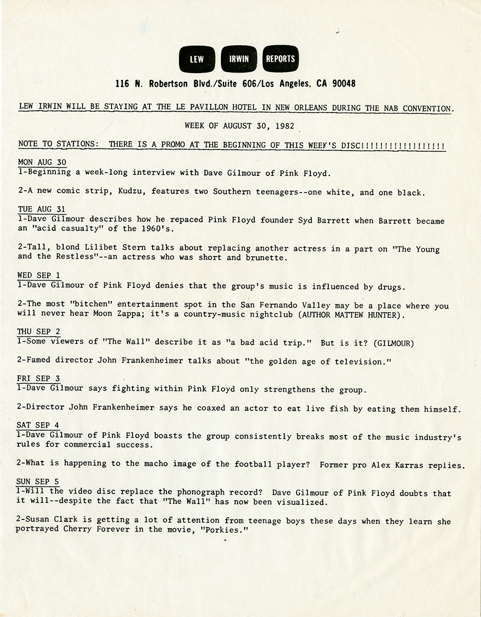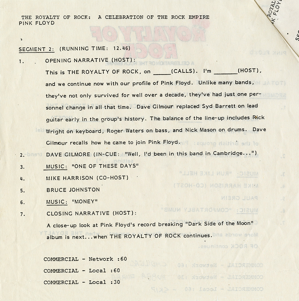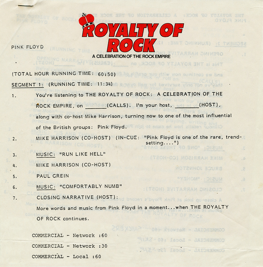 Release Information: A single LP reissue of music and interviews with Pink Floyd. Two-page cue sheet.