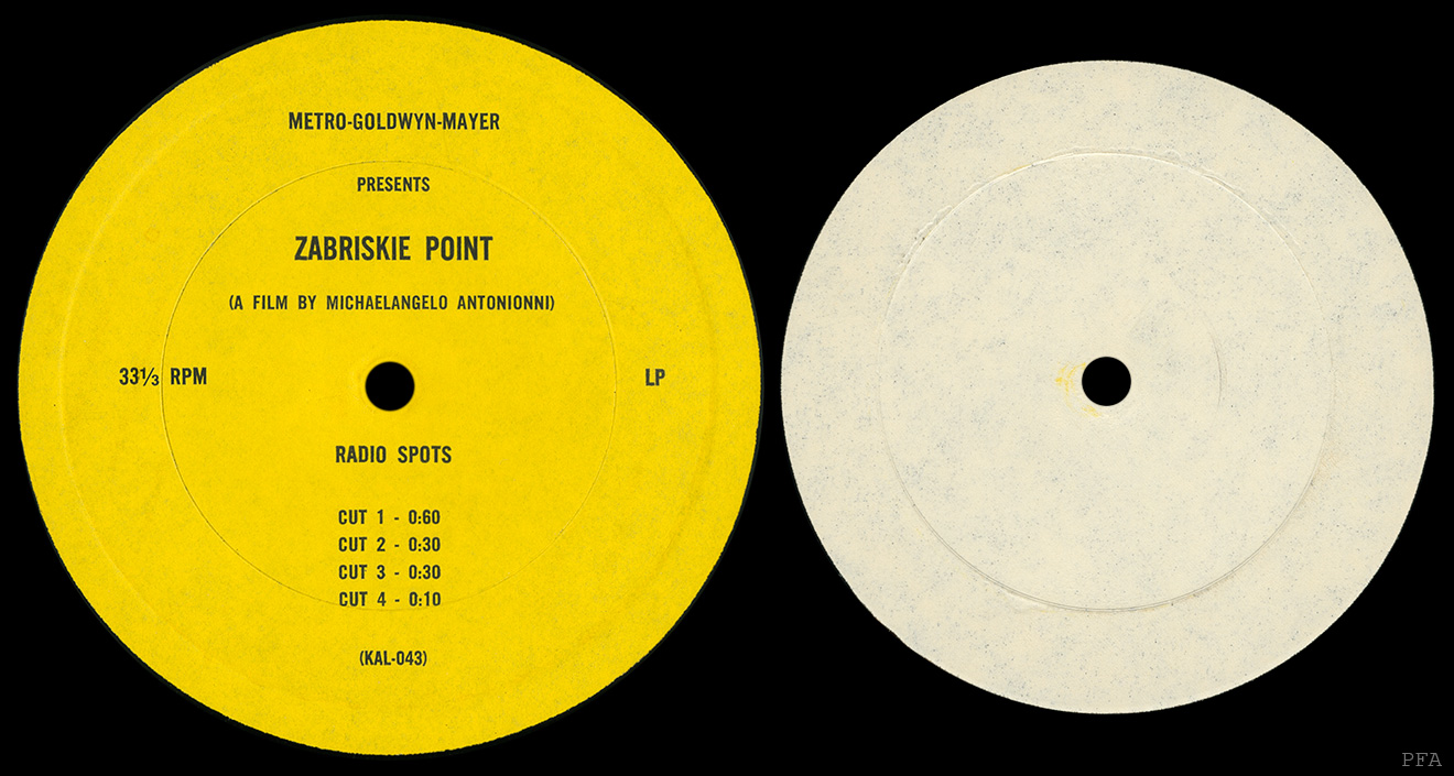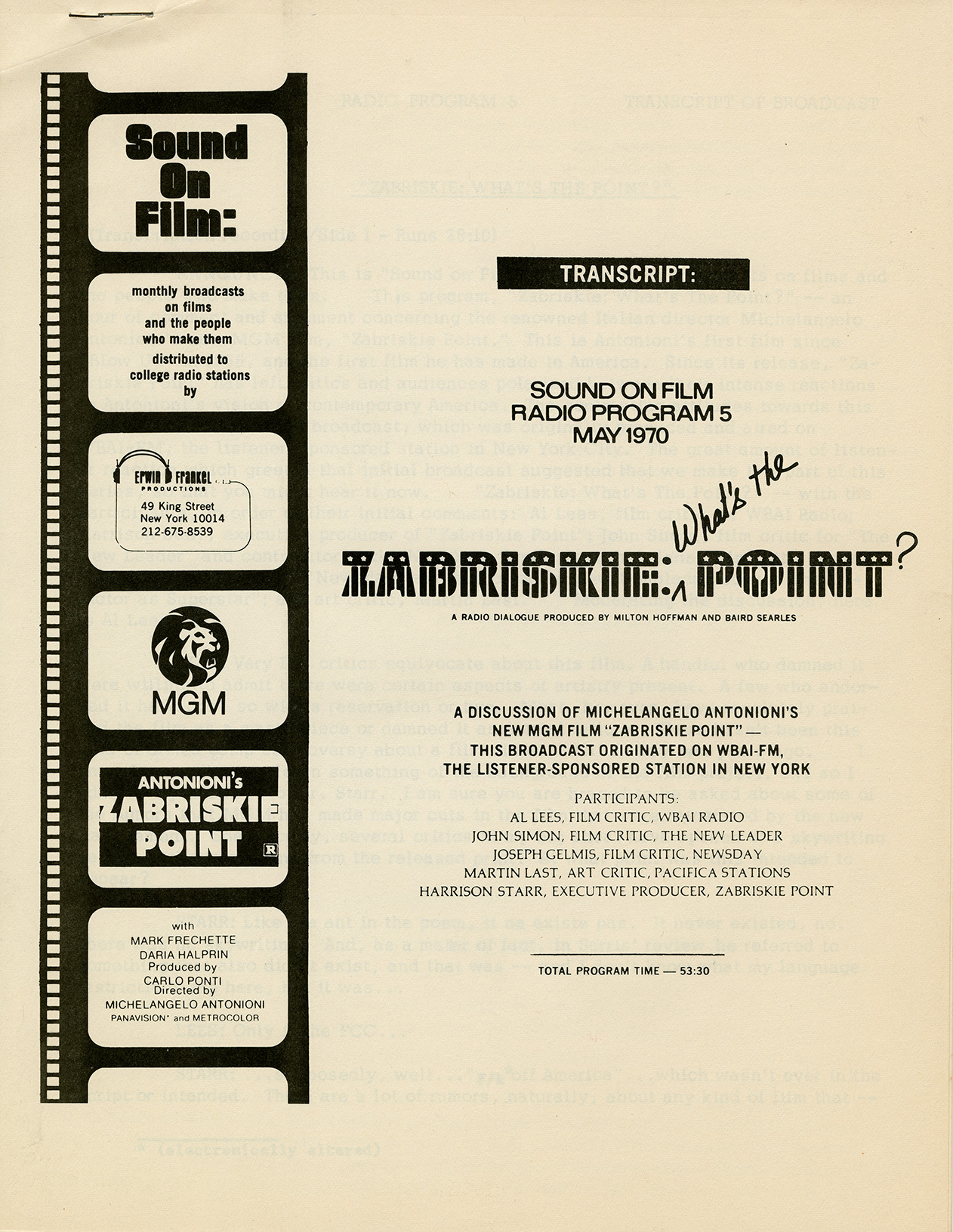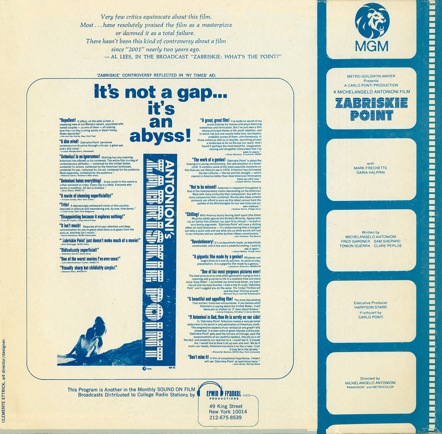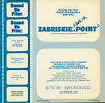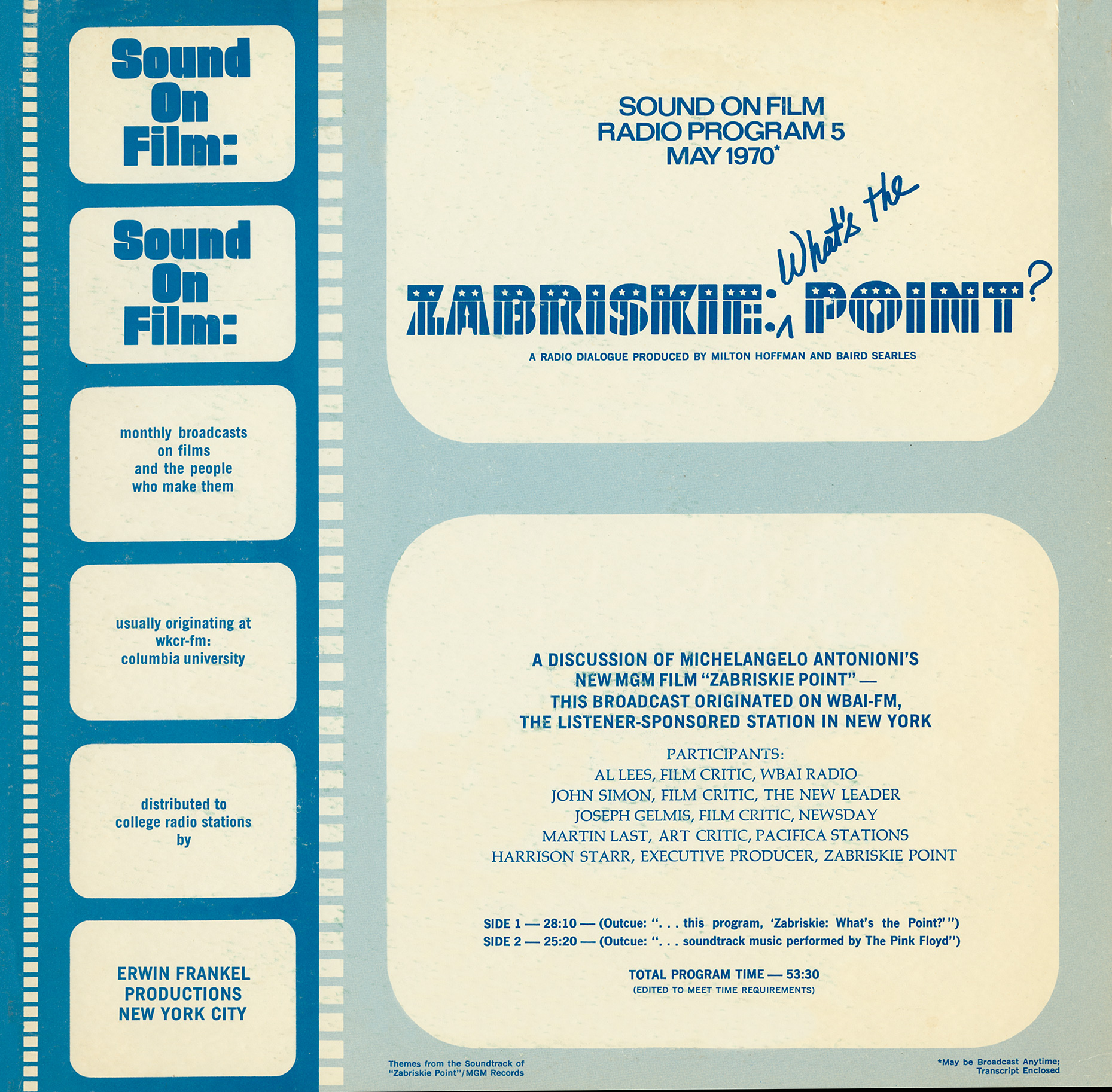 Release Information: A radio show LP distributed to colleges featuring a discussion about the movie, Zabriskie Point, by Al Lees, WBAI film critic, John Simon, The New Leader film critic, Joseph Gelmis, Newsday film critic, Martin Last, Pacifica Stations art critic, and Harrison Starr, the movie's executive producer. Features music by Pink Floyd at the beginning and end.