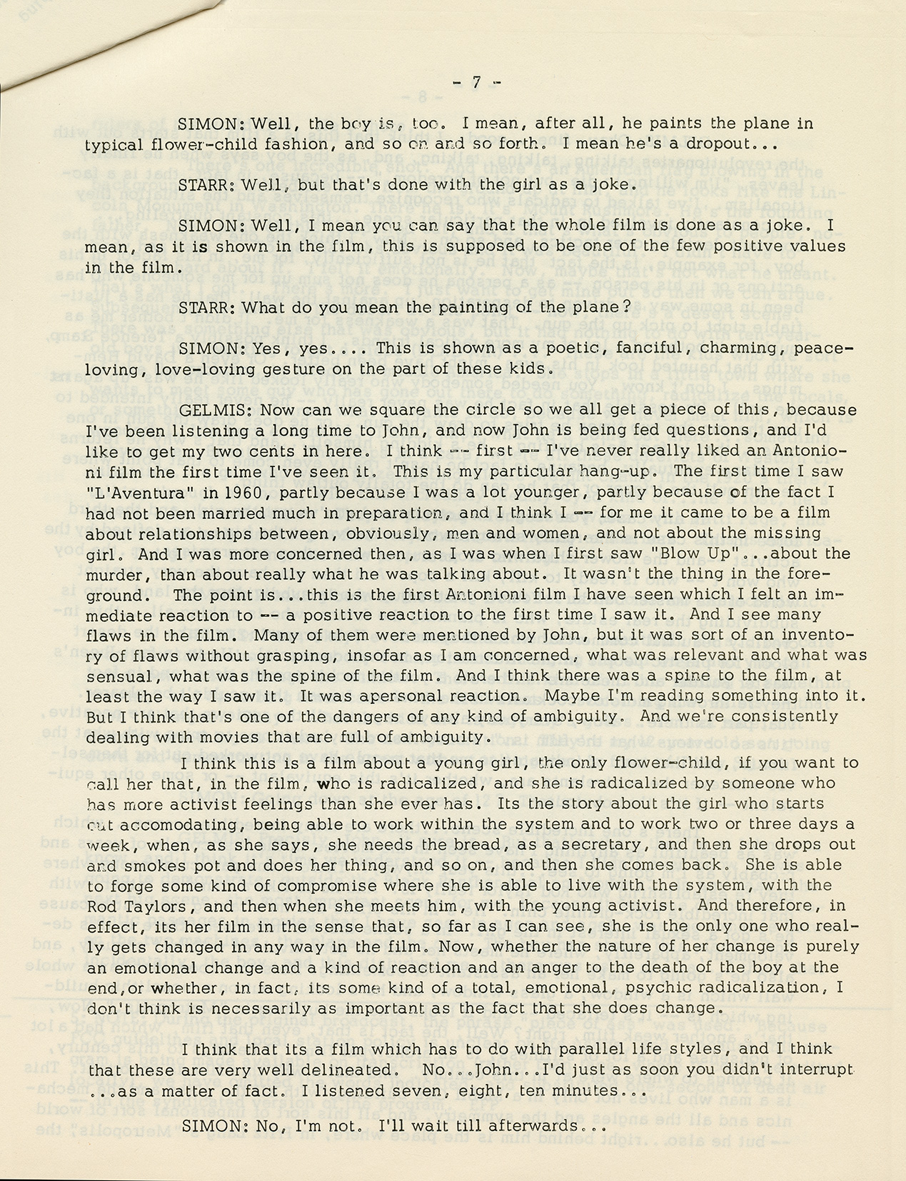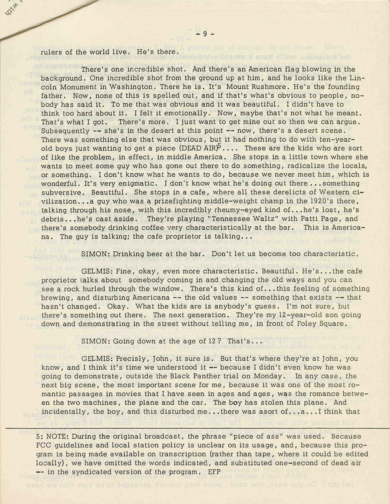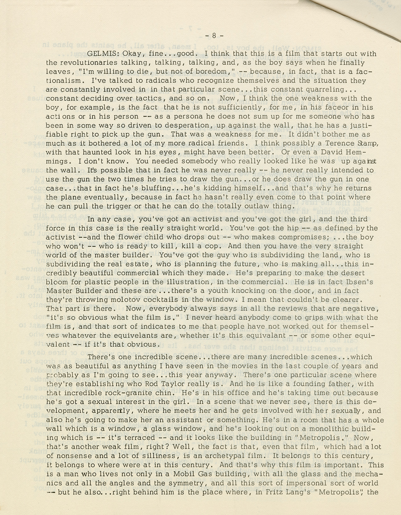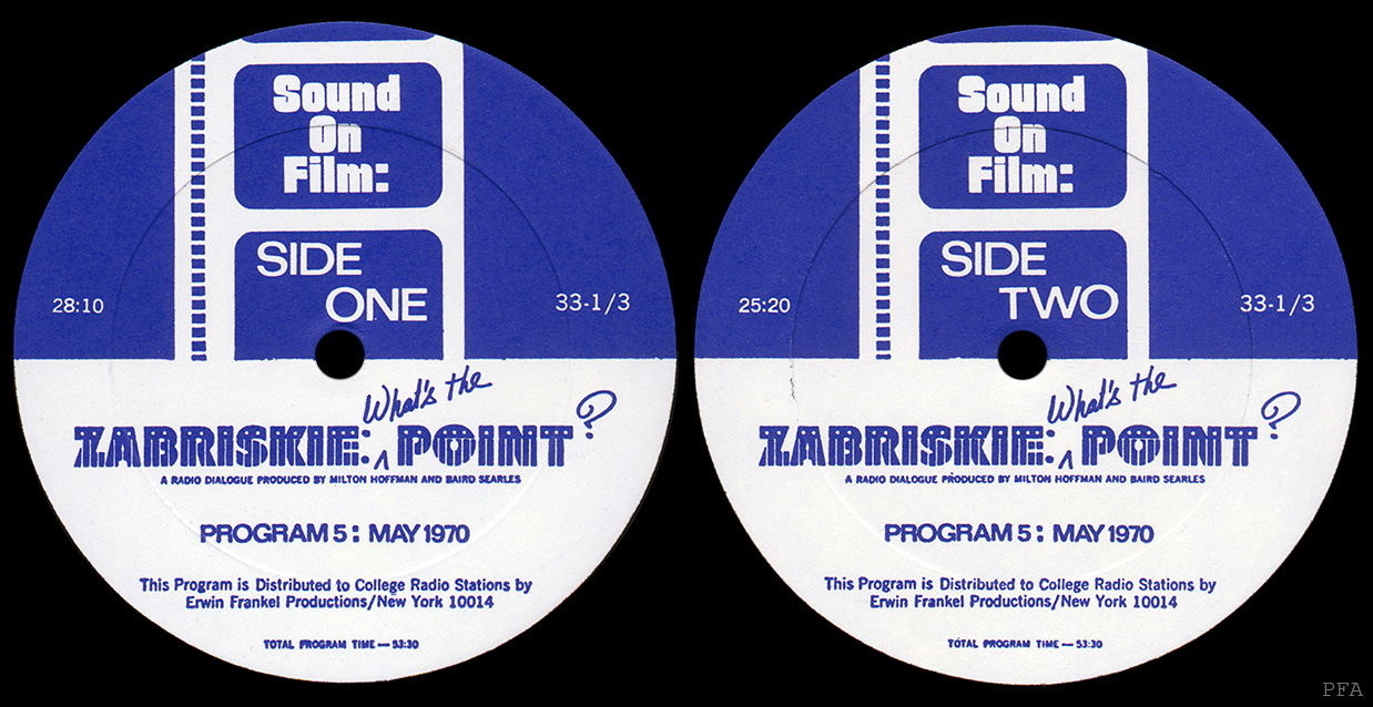 Release Information: A radio show LP distributed to colleges featuring a discussion about the movie, Zabriskie Point, by Al Lees, WBAI film critic, John Simon, The New Leader film critic, Joseph Gelmis, Newsday film critic, Martin Last, Pacifica Stations art critic, and Harrison Starr, the movie's executive producer. Features music by Pink Floyd at the beginning and end.