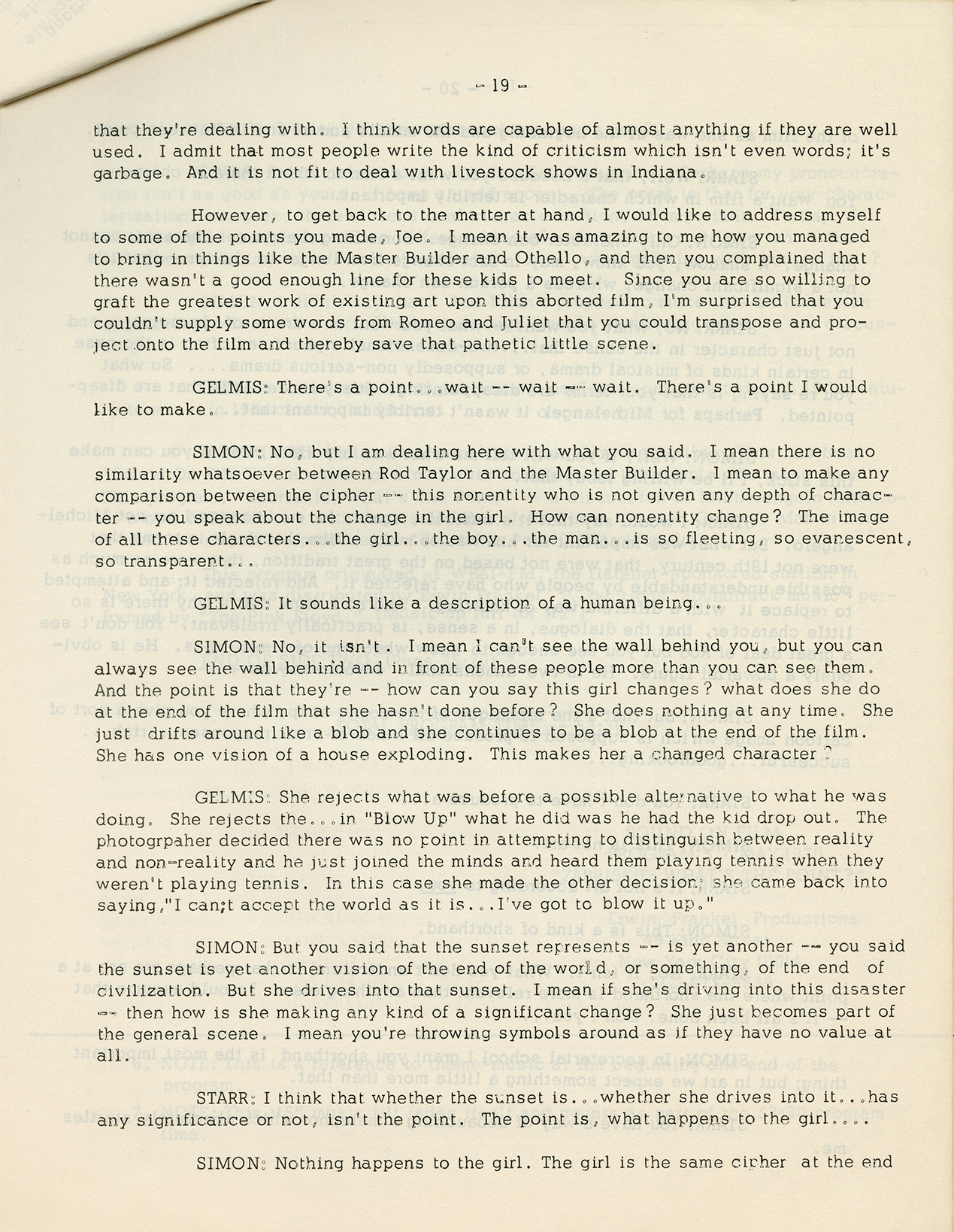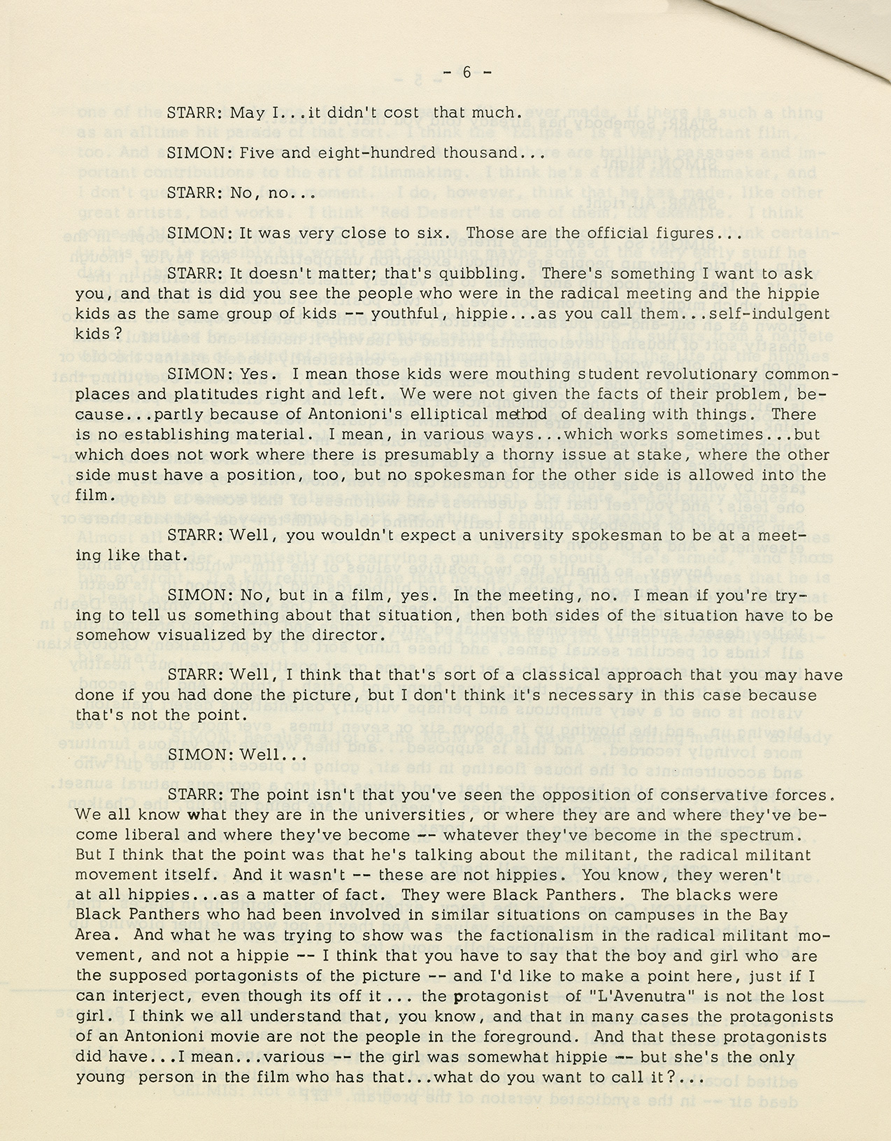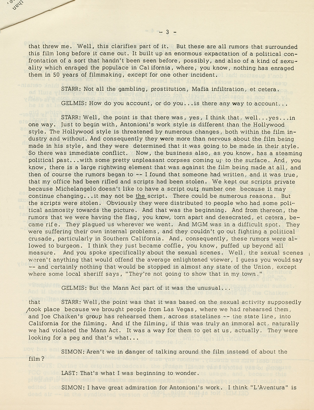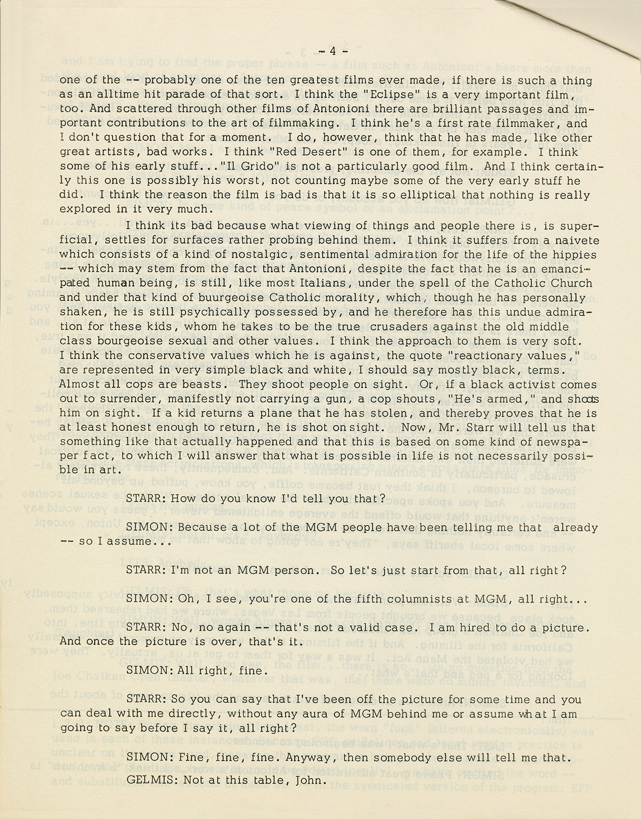 Release Information: A radio show LP distributed to colleges featuring a discussion about the movie, Zabriskie Point, by Al Lees, WBAI film critic, John Simon, The New Leader film critic, Joseph Gelmis, Newsday film critic, Martin Last, Pacifica Stations art critic, and Harrison Starr, the movie's executive producer. Features music by Pink Floyd at the beginning and end.