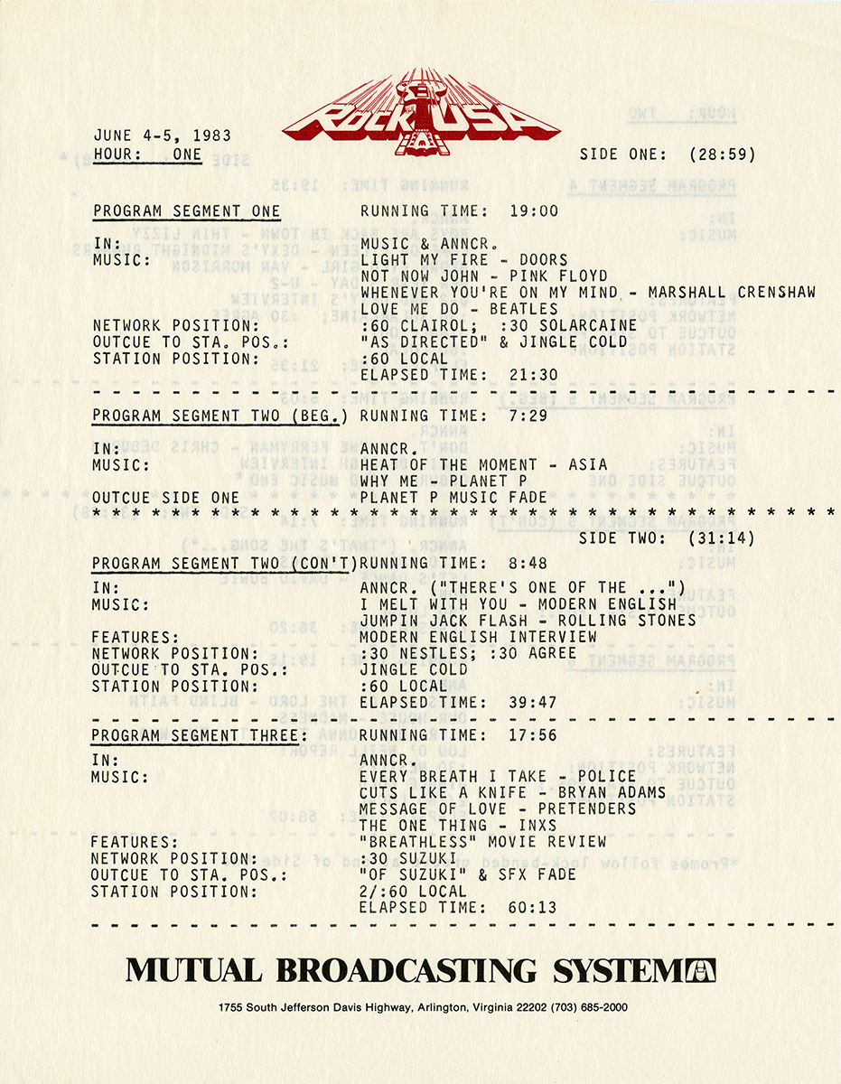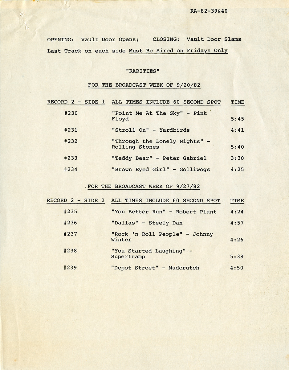 Release Information: A 52-hour 52 LP radio show covering the history of rock and roll. Silver annivbersary edition. Hosted by Bill Drake. Features the Pink Floyd during hour 48. Cue sheets.