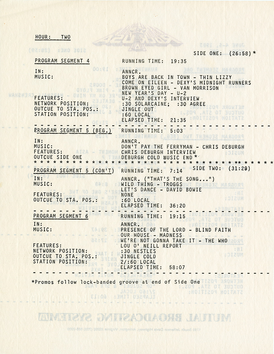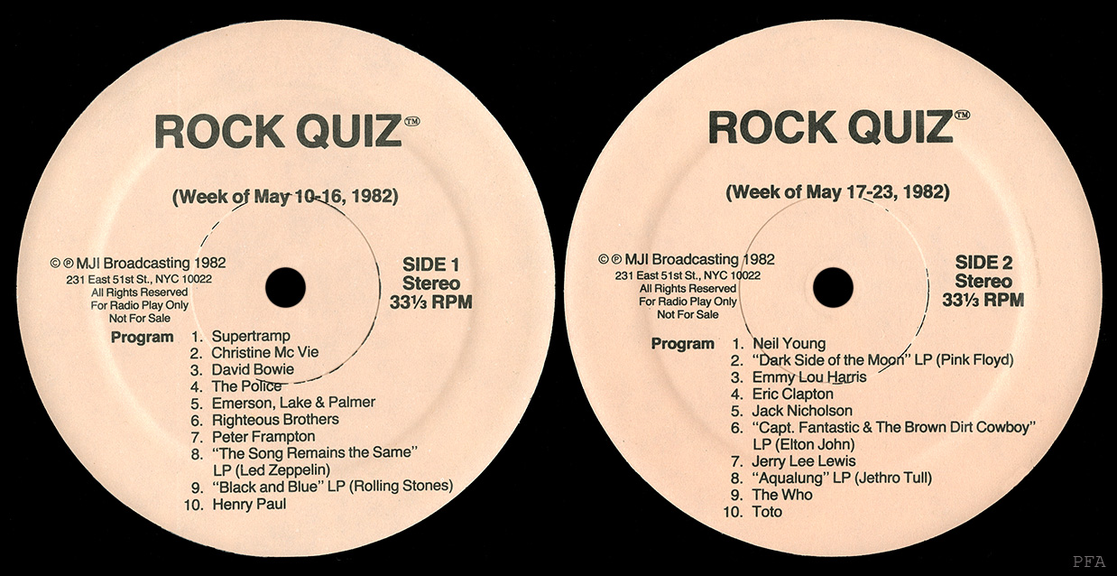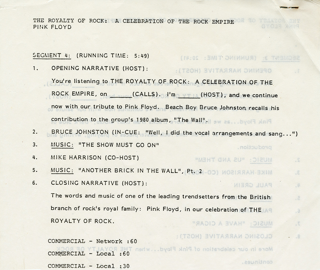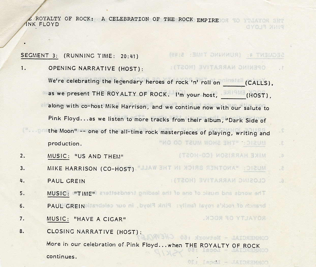 Release Information: A triple LP featuring Bill Wyman of the Rolling Stones acting as guest DJ and playing songs. One of the songs he plays is the Pink Floyd song, Money. The flip side of every record is a guest DJ program. Three-page cue sheet.