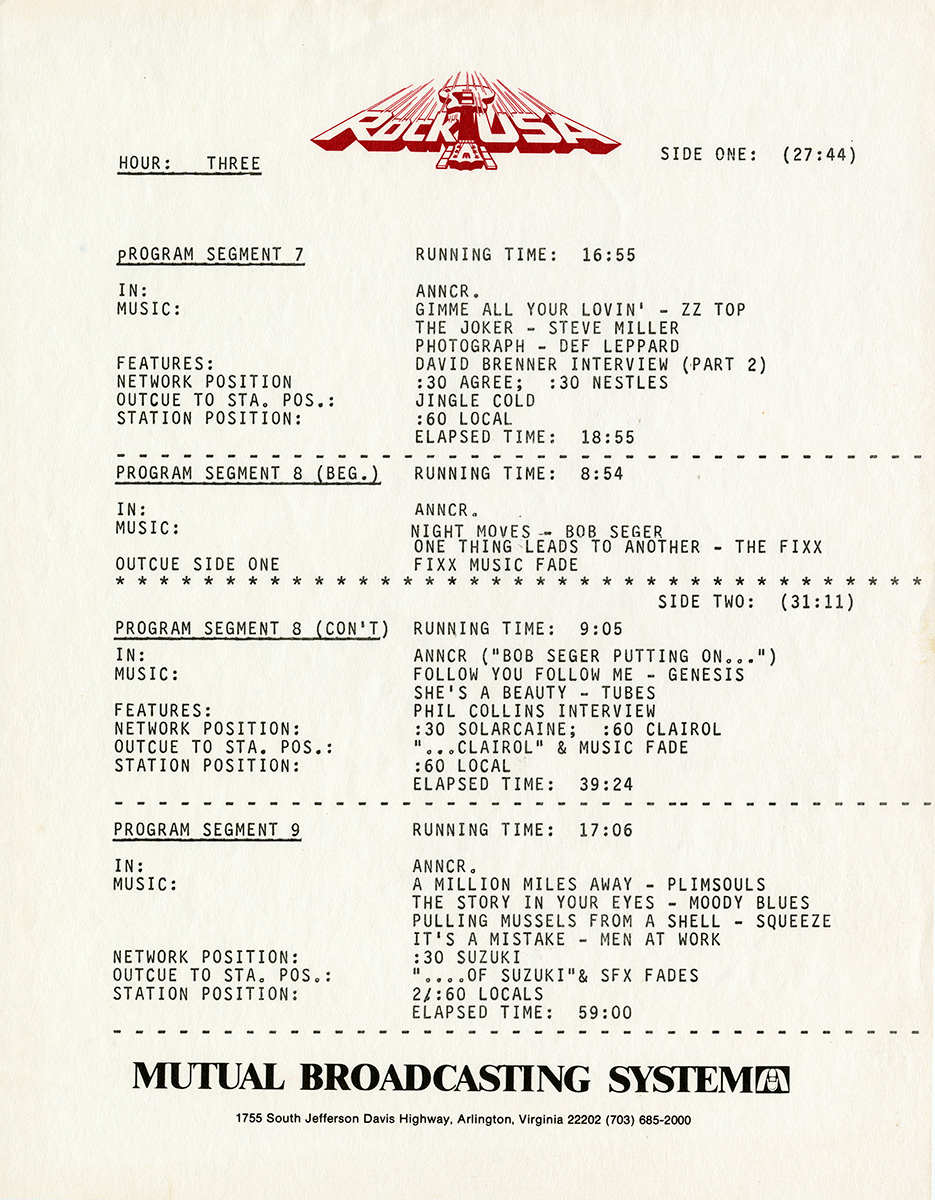 Release Information: A three-LP radio show featuring the Top 30 hits of the week. This show features the Pink Floyd song, Another Brick in the Wall, part 2. Alos includes Andy Gibb Desire, Bob Seger Against the Wind, Doobie Brothers Real Love, Christopher Cross, Elton John Little Jeannie, Captain and Tennille Do That To Me One More Time, Spinners, Leo Sayer, Fleetwood Mac Sara, Bob Seger Fire, Kenny Rogers & Kim Carnes, Billy Joel You May Be Right, Queen Crazy Little Thing Called Love, Another One Bites The Dust, Pointer Sisters, Eagles The Long Run, Air Supply, Olivia Newton John Magic, Ambrosia, Diana Ross Upside Down, Billy Joel It's Still Rock and Roll To Me, Michael Jackson Rock With You, Barbara Streisand, Blondie Call Me, and Paul McCartney & Wings. Three cue sheets.