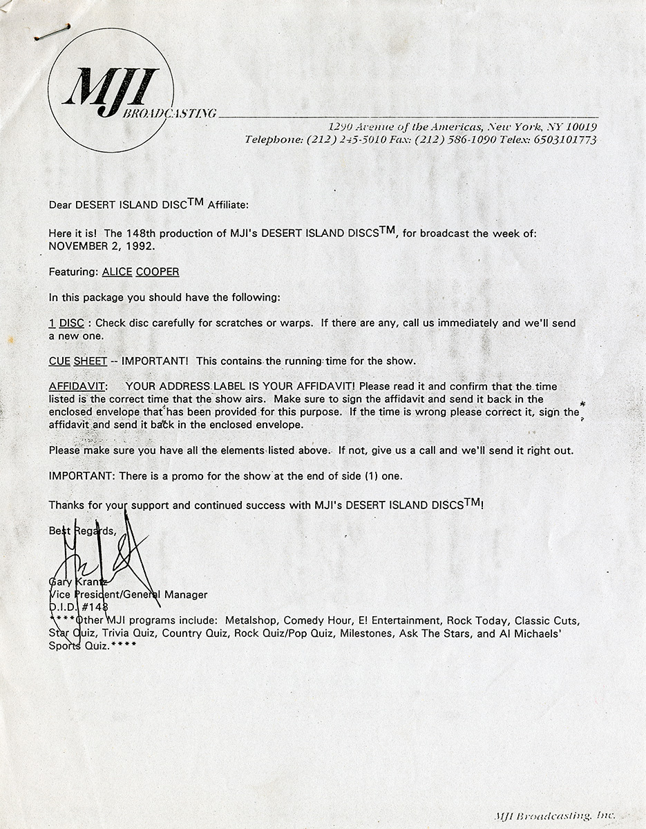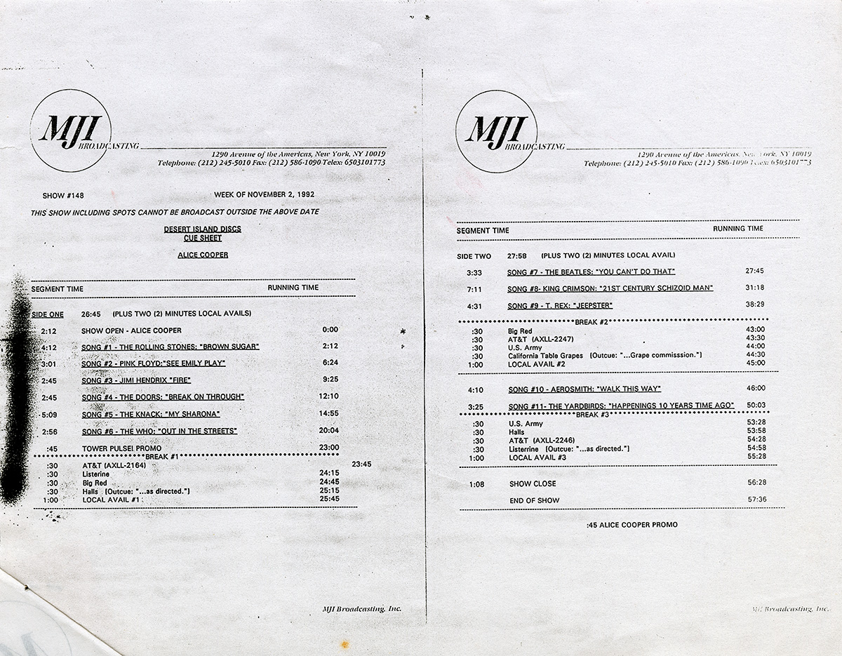 Release Information: A single LP radio show hosted by Alice Cooper. Alice picks the songs to play, which include The Rolling Stones-Brown Sugar, Pink Floyd-See Emily Play, Jimi Hendrix-Fire, Doors-Break On Through, The Knack-My Sharona, The Who-Out In the Streets, Beatles-You Can't Do That, King Crimson-21st Century Schizoid Man, and T.Rex-Jeepster. Cue sheet.