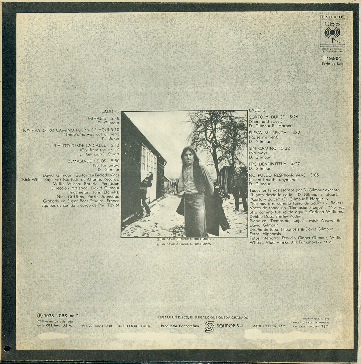 Front Cover: Picture of David Gilmour with the text (white letters on black background) "Album del Cantante y Guitarrista de PINK FLOYD." The catalog number and CBS-logo are in the upper left corner and the words DAVID GILMOUR in the upper right corner.