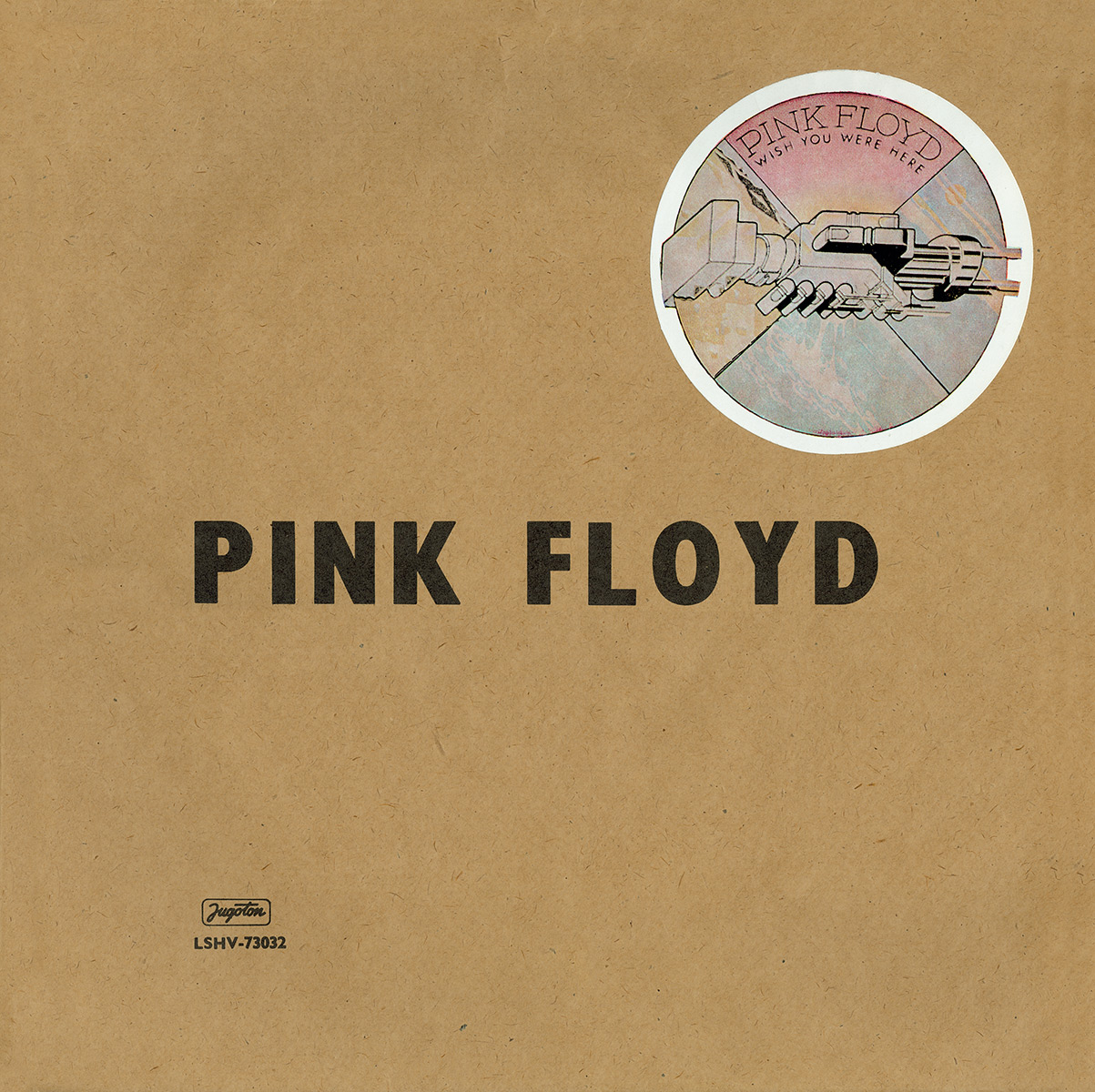 Cover Wrapper: The album is covered by a light brown paper wrapper with "PINK FLOYD" in black letters, and a round WYWH sticker with a thick white border. The catalog number and Jugoton logo is in the bottom left corner of the wrapper.