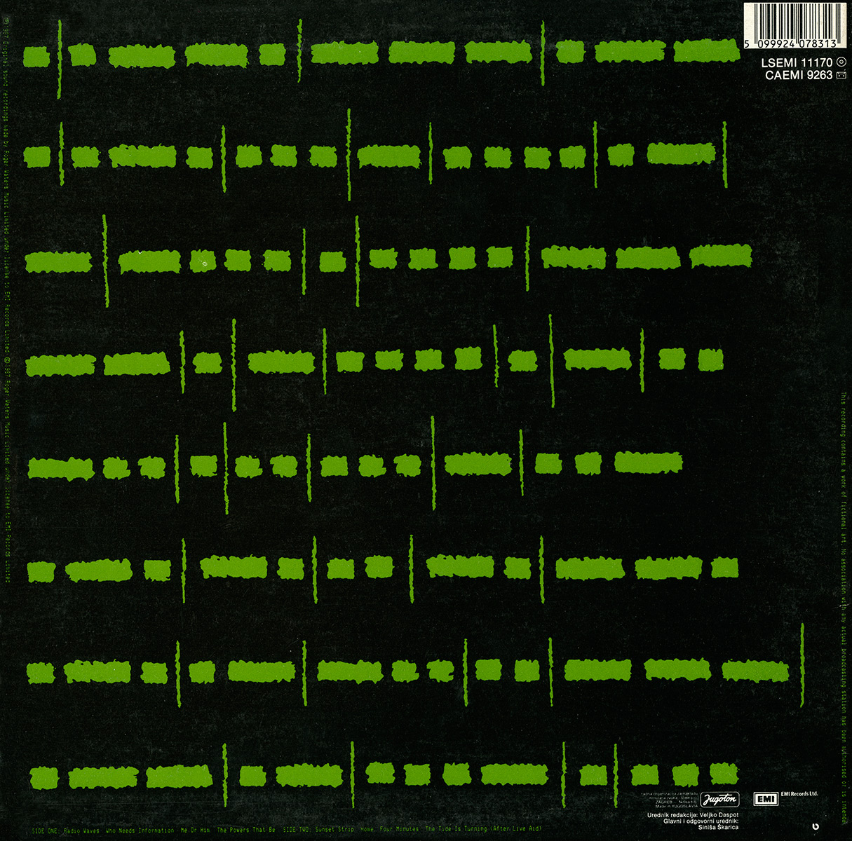 Back Cover: Green Morse code. Song titles. Bar code.