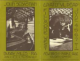 BG 237-1 - John Sebastian / Buddy Miles / RIG, June 11-14, 1970, the back of this card has an upcoming calendar of events for the Fillmore West, and the Oakland Coliseum, with dates listed for Sha Na Na / Pacific Gas & Electric / Crosby Stills Nash & Young / Traffic, (BG 238-1) (art by David Singer), A, $35