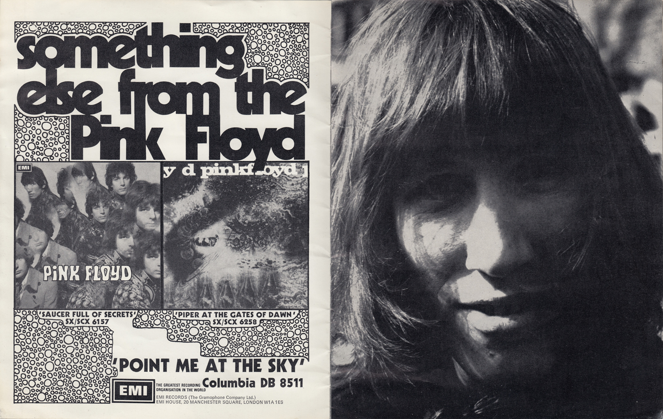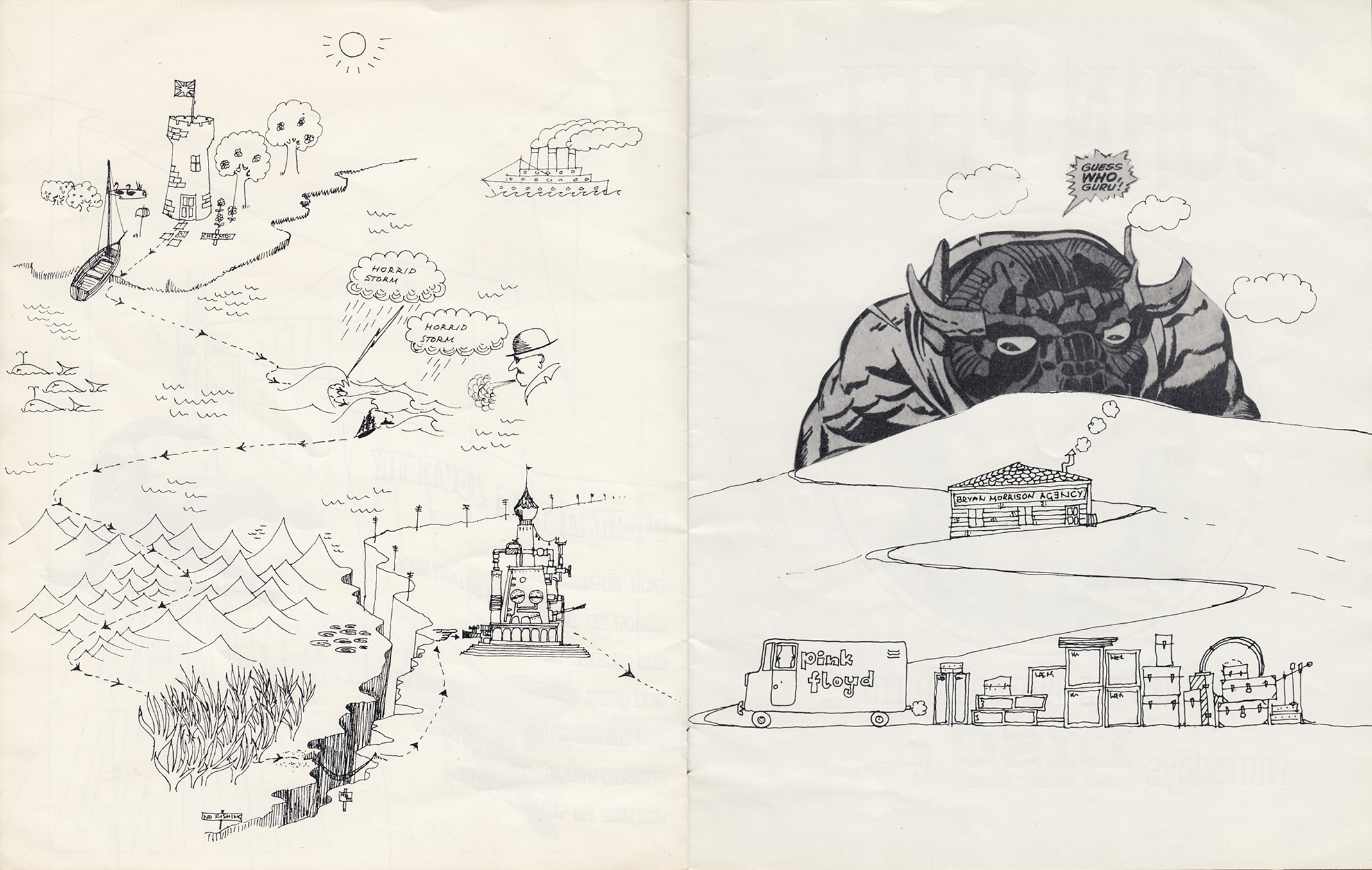 Folder Info: Includes Pink Floyd tour dates, a Bryan Morrison Agency, Ltd. address, six Pink Floyd pictures, a Musicland ad, an EMI ad for The Piper at the Gates of Dawn, A Saucerful of Secrets, and Point Me at the Sky, credits (photographs by Hipgnosis), Part I The Man / Part II The Journey with song titles, sketches, a John Peel ad, an IT ad, and a WEM ad.