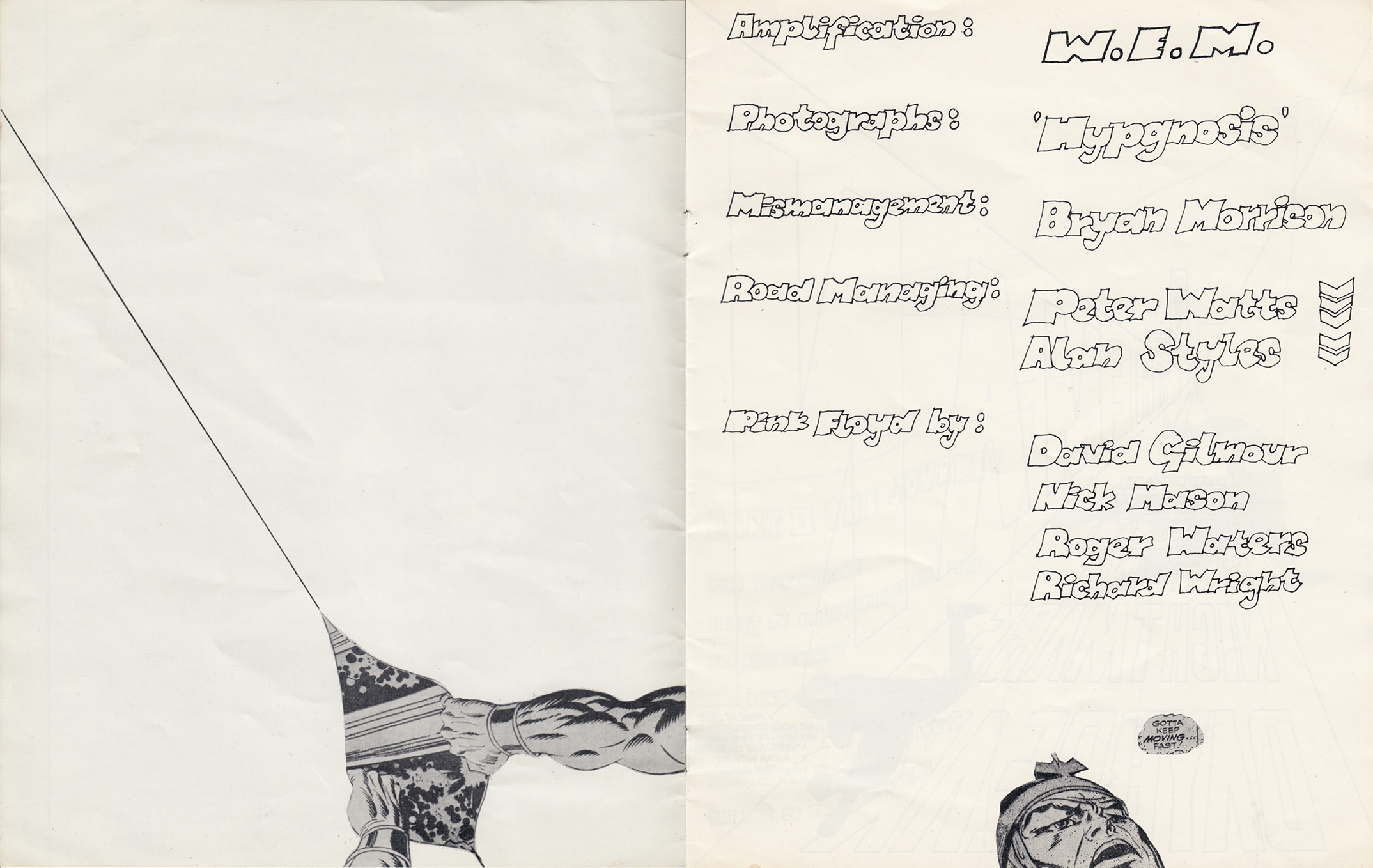 Folder Info: Includes credits, comics (Rog of the Rovers, Captain Mason, R.N., Rich Right - He's Rich & He's Right, The Exploits of Dave Derring), Life Lines, The Big Brainstrainer Quiz Special, lyrics for Shine On You Crazy Diamond, Raving and Drooling, Gotta Be Crazy, and The Pink Floyd Lucky Pyramid Sign. Programme by Hipgnosis + Nick Mason, Gerald Scarfe, Paul Stubbs, Joe Petagno, Colin Elgie, Richard Evans and Dave Gale.